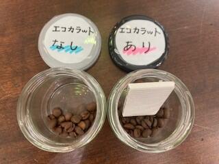 ビンにコーヒー豆を入れ、エコカラットを『入れる』『入れない』の2パターンを作りました。