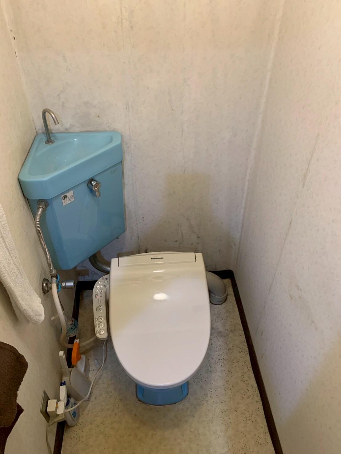 築50年ほどのマンションのトイレをリフォームさせていただきました。 収納付き『Jフィット』。トイレ用品を収納できるので見た目もスッキリです。 フロアタイル、クロスも張替えられました。アクセントクロスがおしゃれです。 手すりをつけたので移動がスムーズになりました。