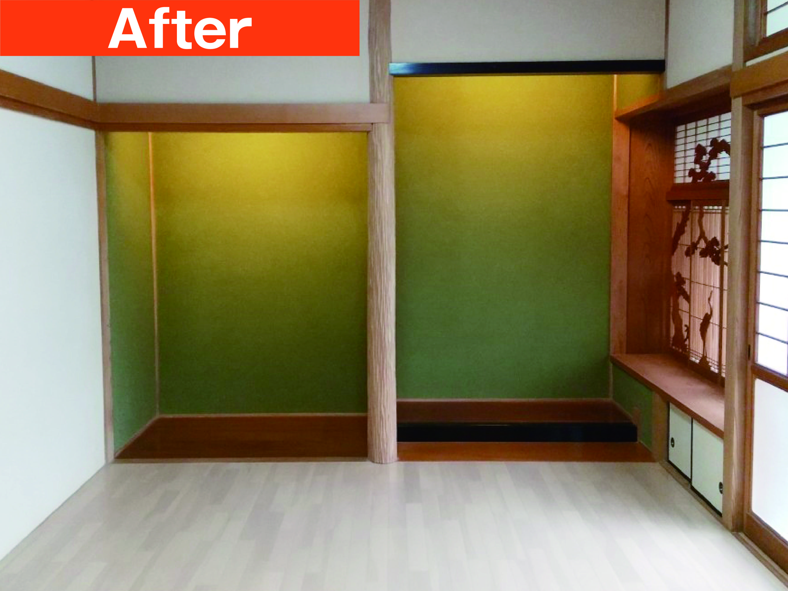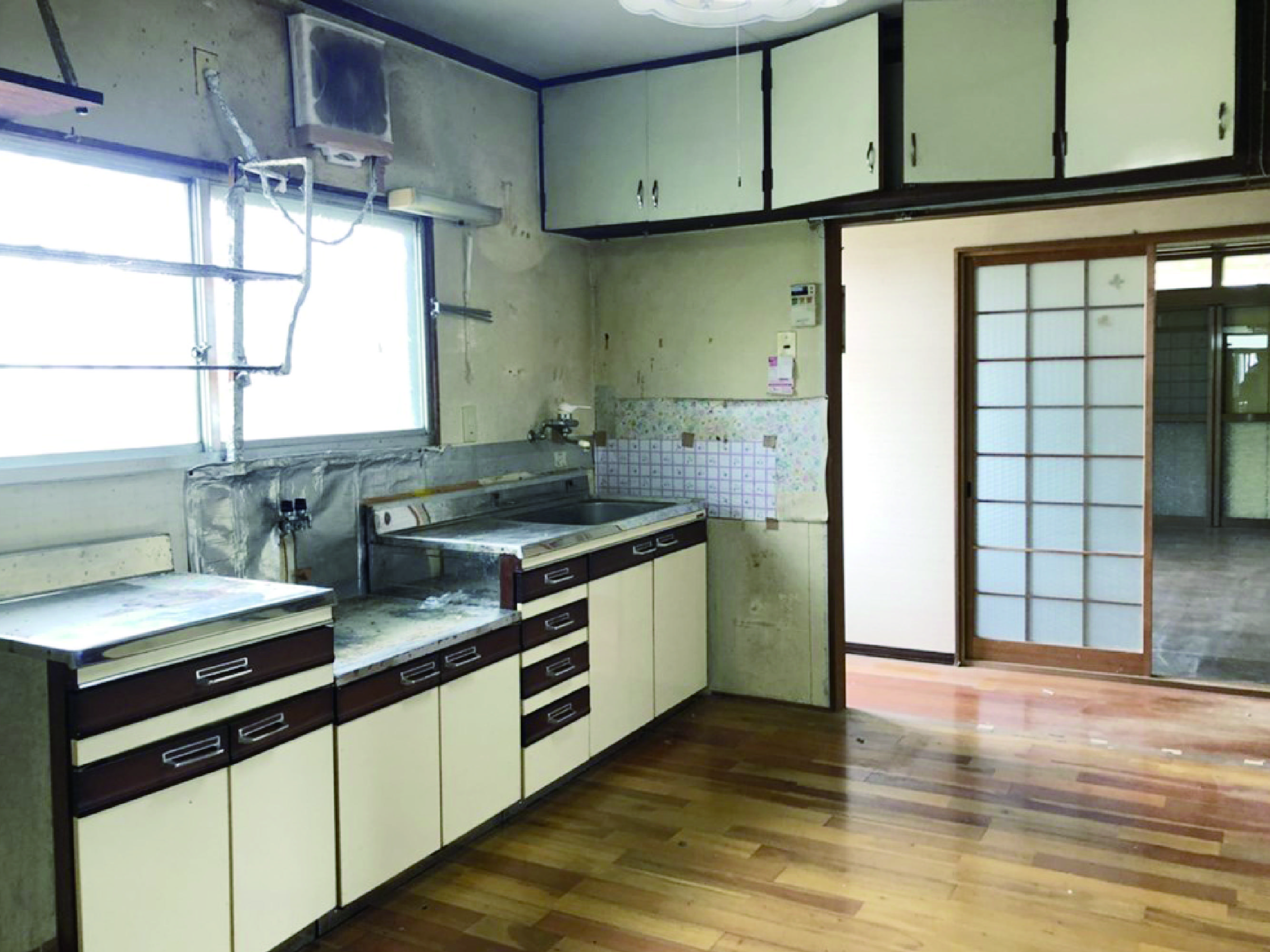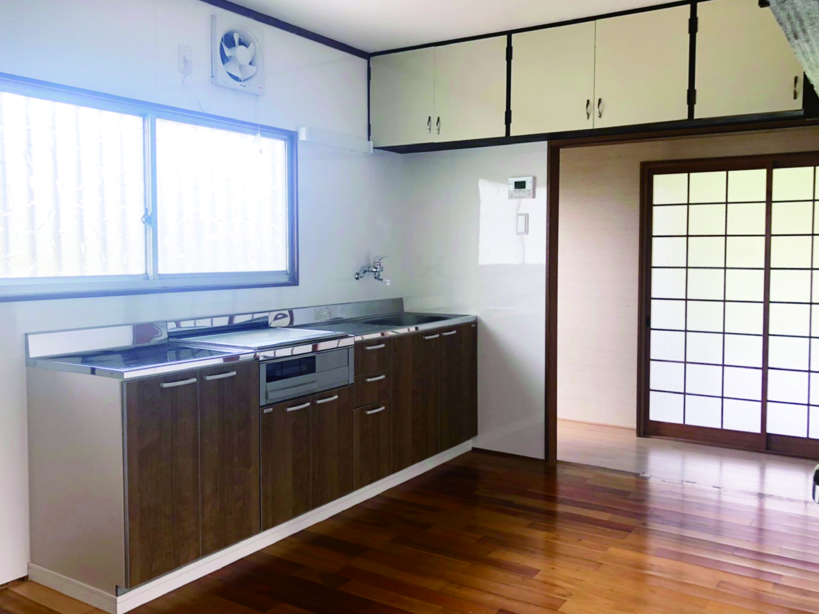 水回りを一新! 小さな浴槽から広々ユニットバスへ。 キッチンは壁をキッチンパネルにすることで お掃除がラクになりました。 和室もフローリングに改修。 床の間はそのまま残して和モダンな仕上がりに。