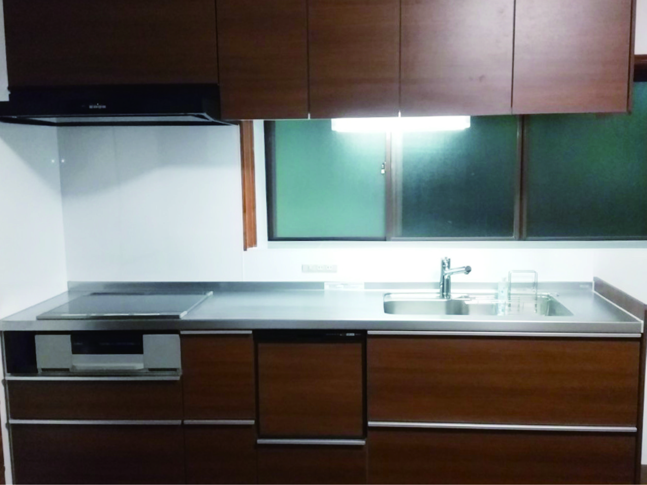 キッチンの上の棚は昇降式で出し入れラクラク。 レンジフードはフィルターがないのでサッと一拭きでお手入れも簡単です。