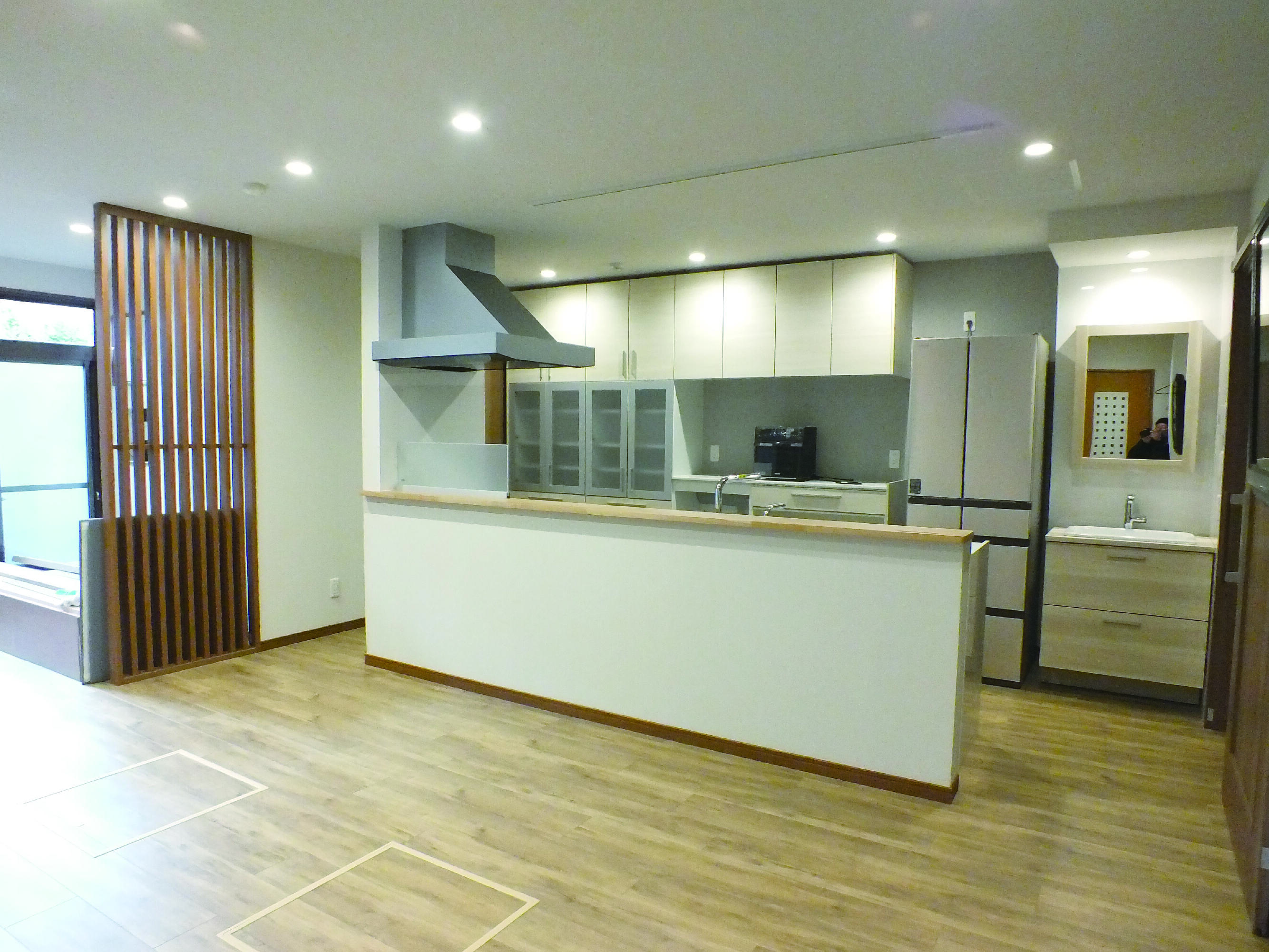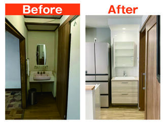 キッチンはアイランドキッチンへ。 パントリーやカップボードなど収納スペースもたっぷり。 洗面台はキッチンの配色とも似合うデザインで空間に馴染みます。