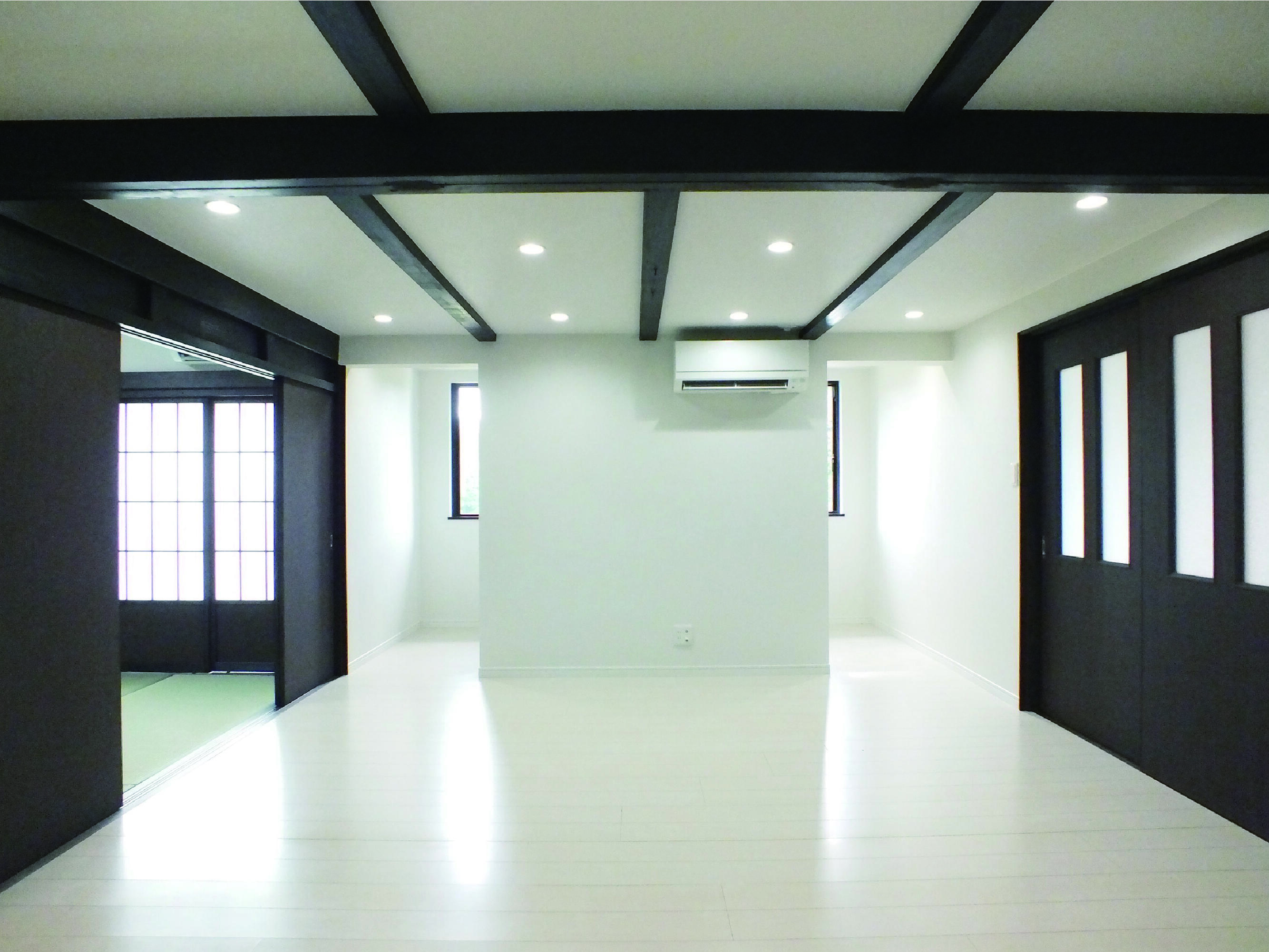 ホワイトの床と壁に黒塗りの梁やダークブラウンの建具がアクセントになった和モダン住宅になっています。