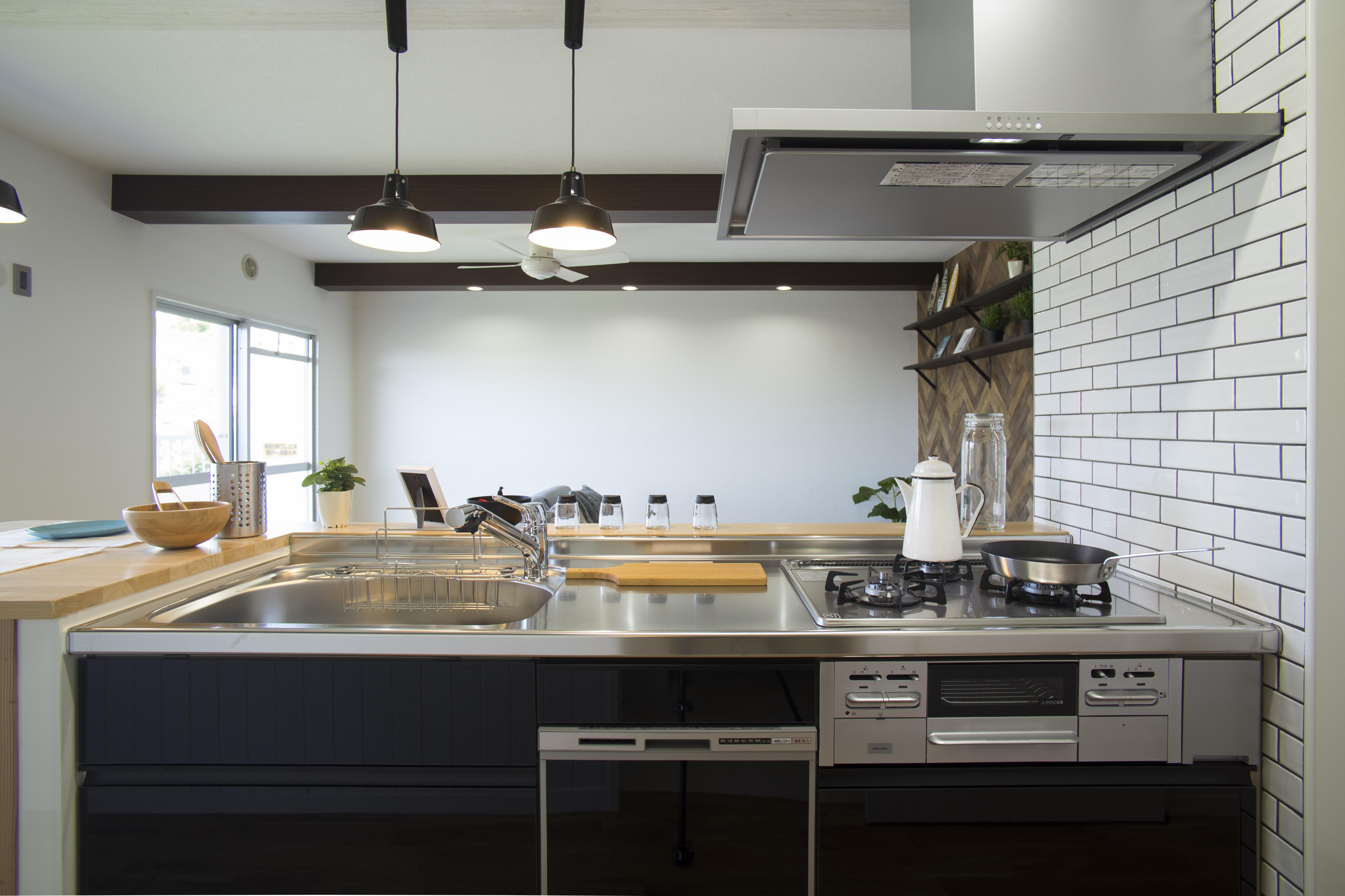 ダイニングキッチンと和室で構成された間取りは1つのLDKに変更。限られた空間を生かすために、キッチンはオープンタイプでコンパクトなものを採用。横にテーブルを造設して、ダイニングまでの動線を最短距離にすることで、広々とくつろげるリビングになりました。壁のアクセントにはヘリンボーンの無垢板を採用し、西海岸をイメージした家づくりをしまいた。