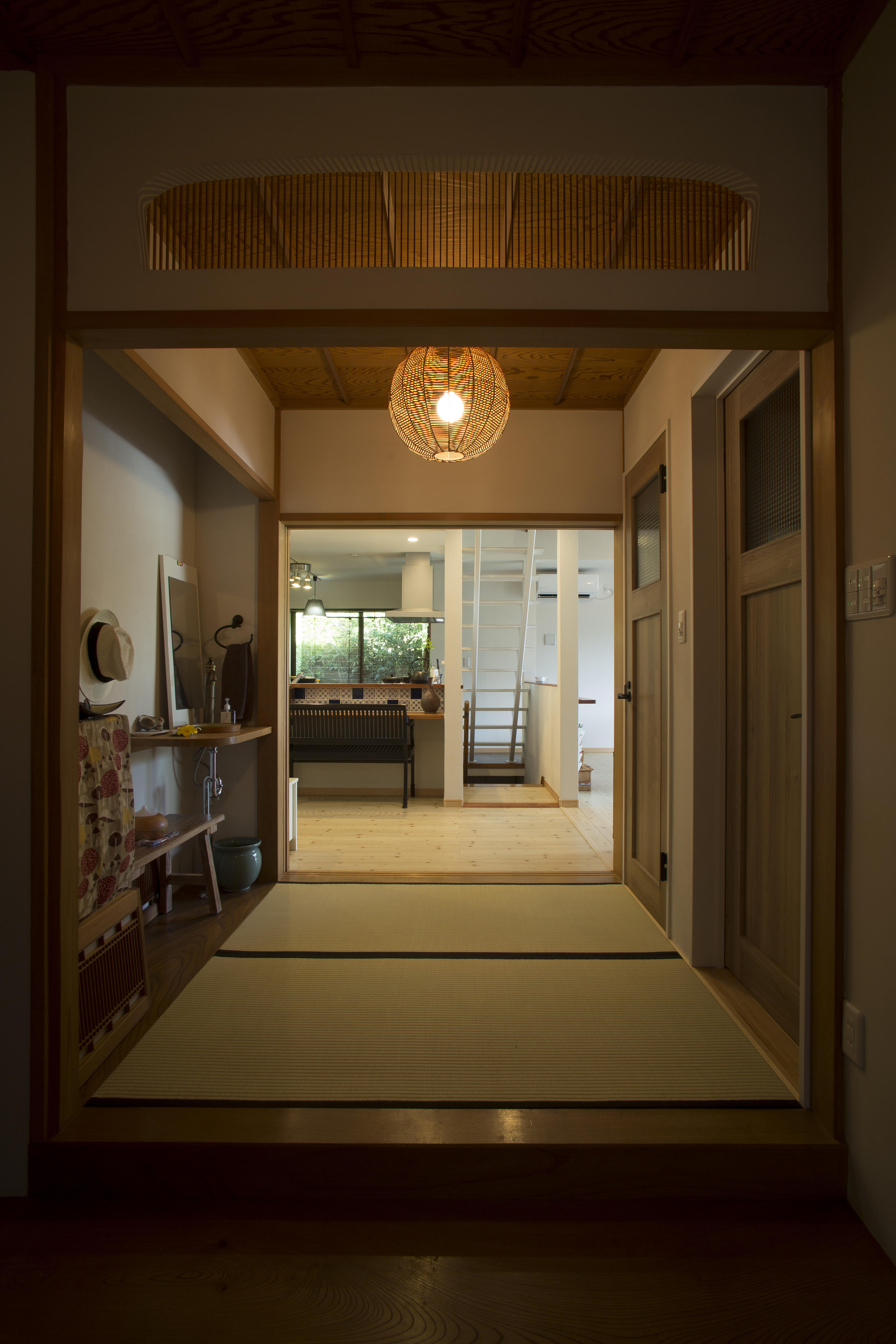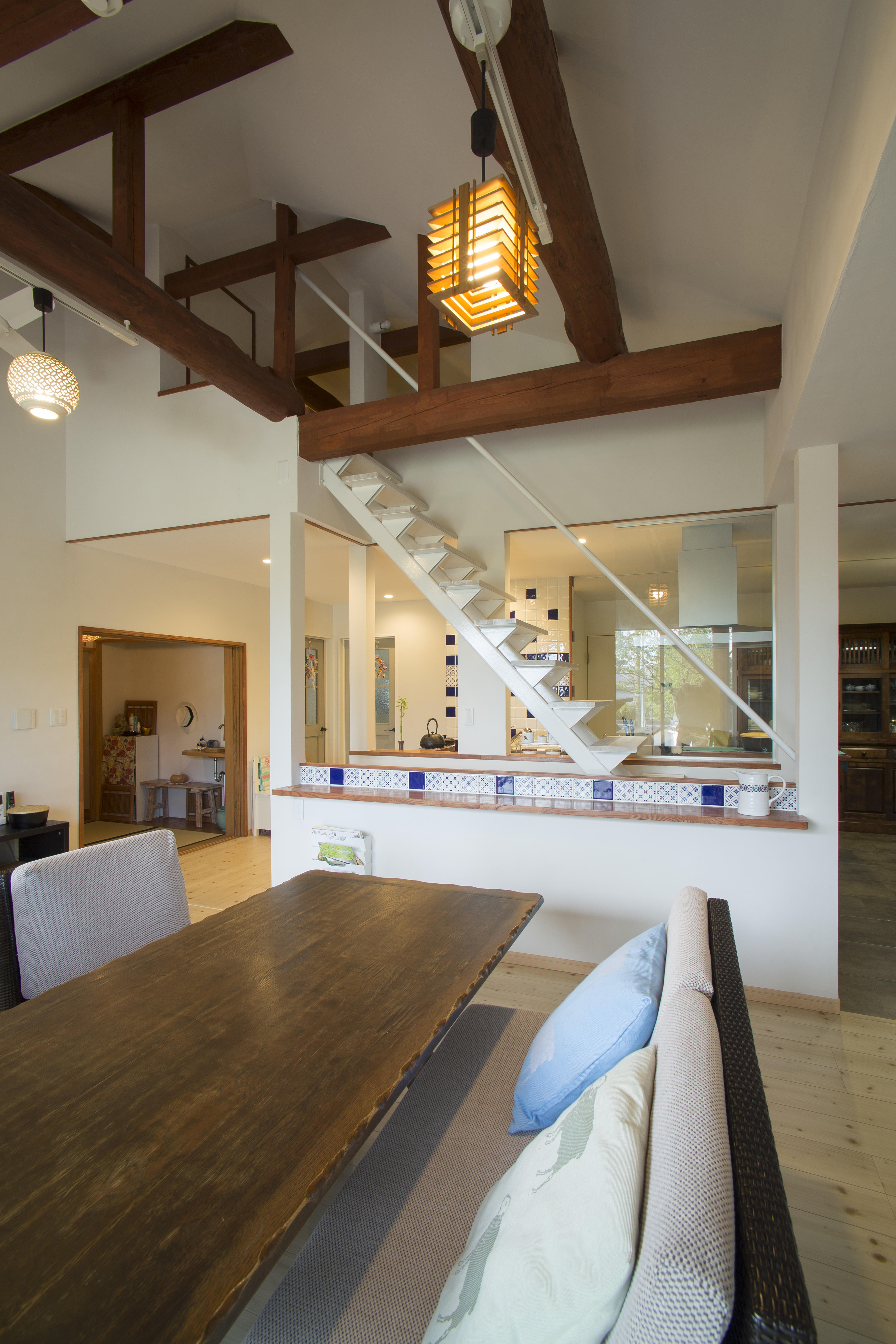 骨組みをあらわにしたミドルスケルトンリフォーム。勾配天井にすることで、天井裏に隠れた立派な梁を露出させ、インテリアの一部として雰囲気を演出。ワイドオープンサッシで空間が広がったLDKには、夏の暑さと冬の寒さを考慮して、吹付断熱を施しました。LDKの中心に位置するキッチンの壁には奥様のお気に入りのタイルを貼り、この先も末永く愛していただける住宅へと生まれ変わりました。