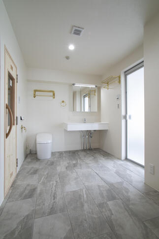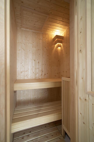 新設のサウナは、フィンランド式の入浴方法であるロウリュタイプのものを採用。トレーニングルームとともに浴室と隣接させ、別荘ならではのくつろぎの空間をつくりあげました。