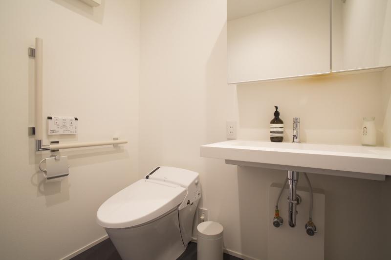 段差の解消と手すりの取り付けの他にも、玄関とは別に車いすでも楽に家に入れるように勝手口の土間を室内の床の高さに合わせました。シンプルかつモダンでありつつも、どこか親しみやすいミッドセンチュリーな空間は、キッチンのアイコニックなロールスクリーンと、ペイント仕上げのネイビーの壁で表現しました。