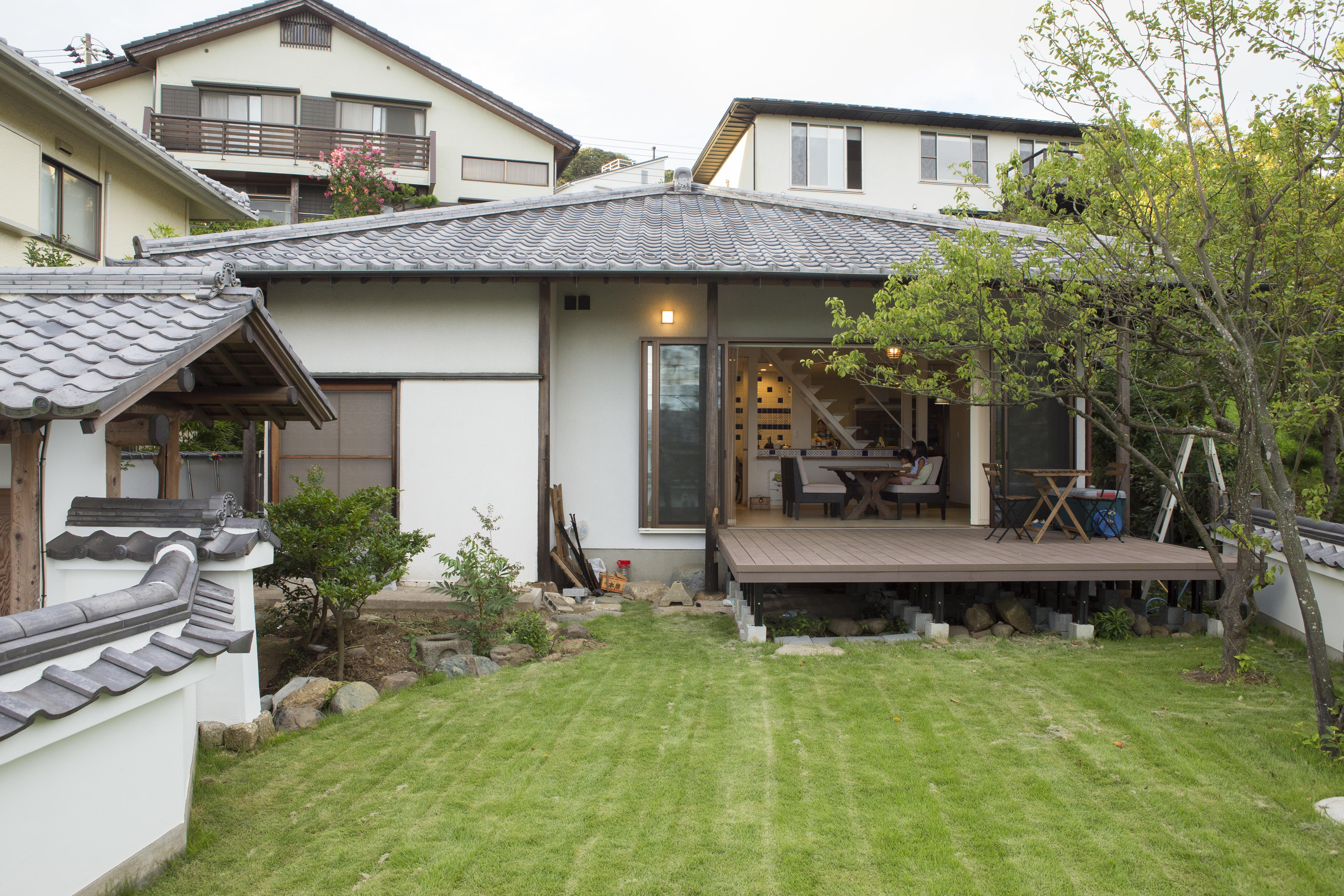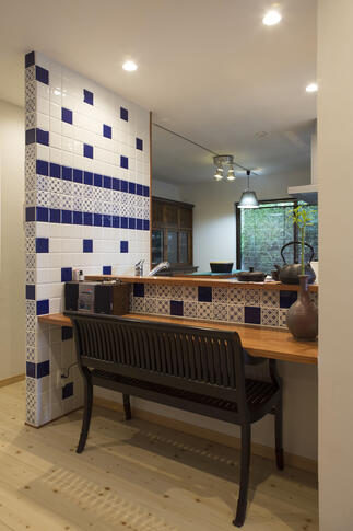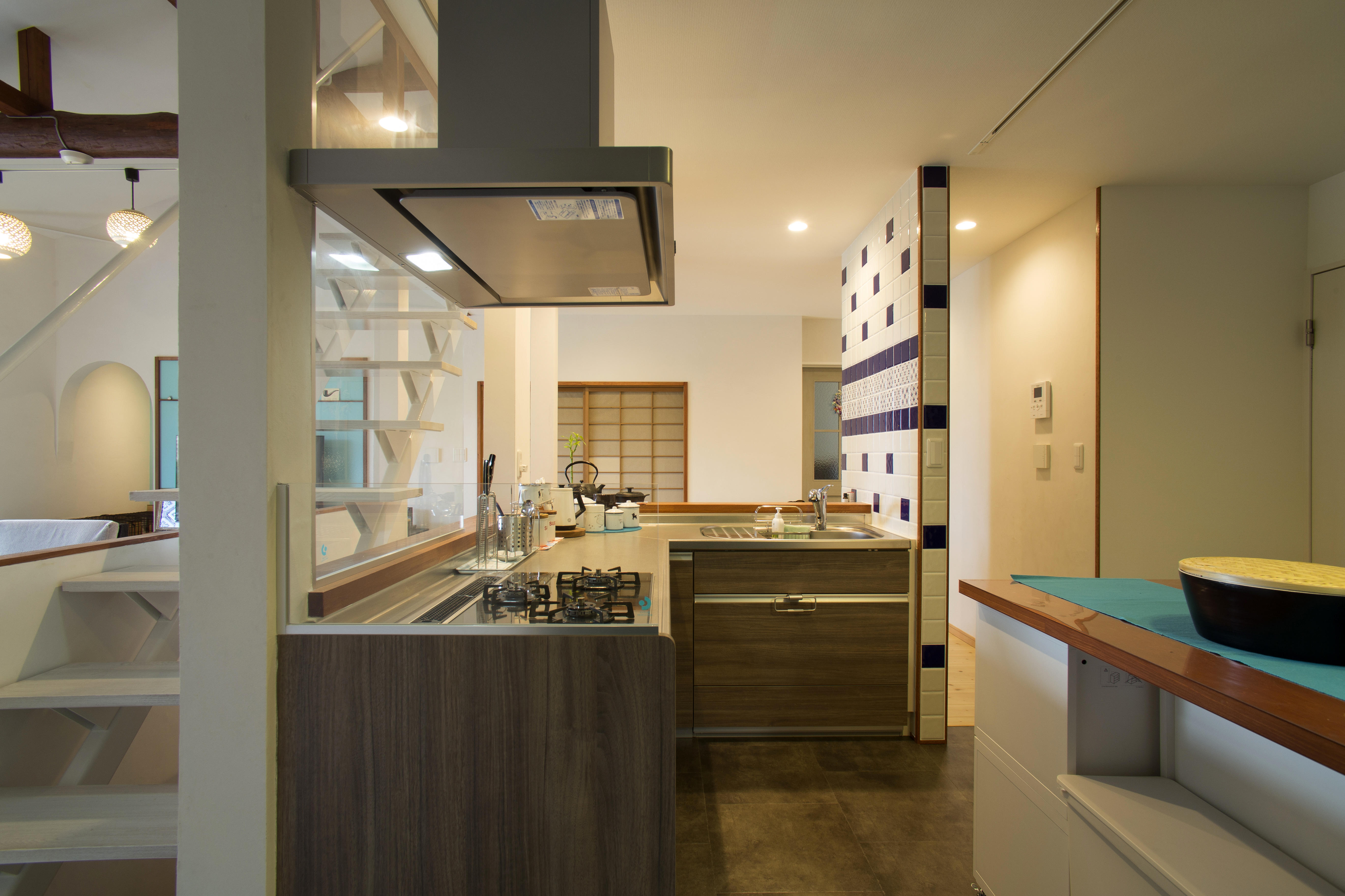 骨組みをあらわにしたミドルスケルトンリフォーム。勾配天井にすることで、天井裏に隠れた立派な梁を露出させ、インテリアの一部として雰囲気を演出。ワイドオープンサッシで空間が広がったLDKには、夏の暑さと冬の寒さを考慮して、吹付断熱を施しました。LDKの中心に位置するキッチンの壁には奥様のお気に入りのタイルを貼り、この先も末永く愛していただける住宅へと生まれ変わりました。