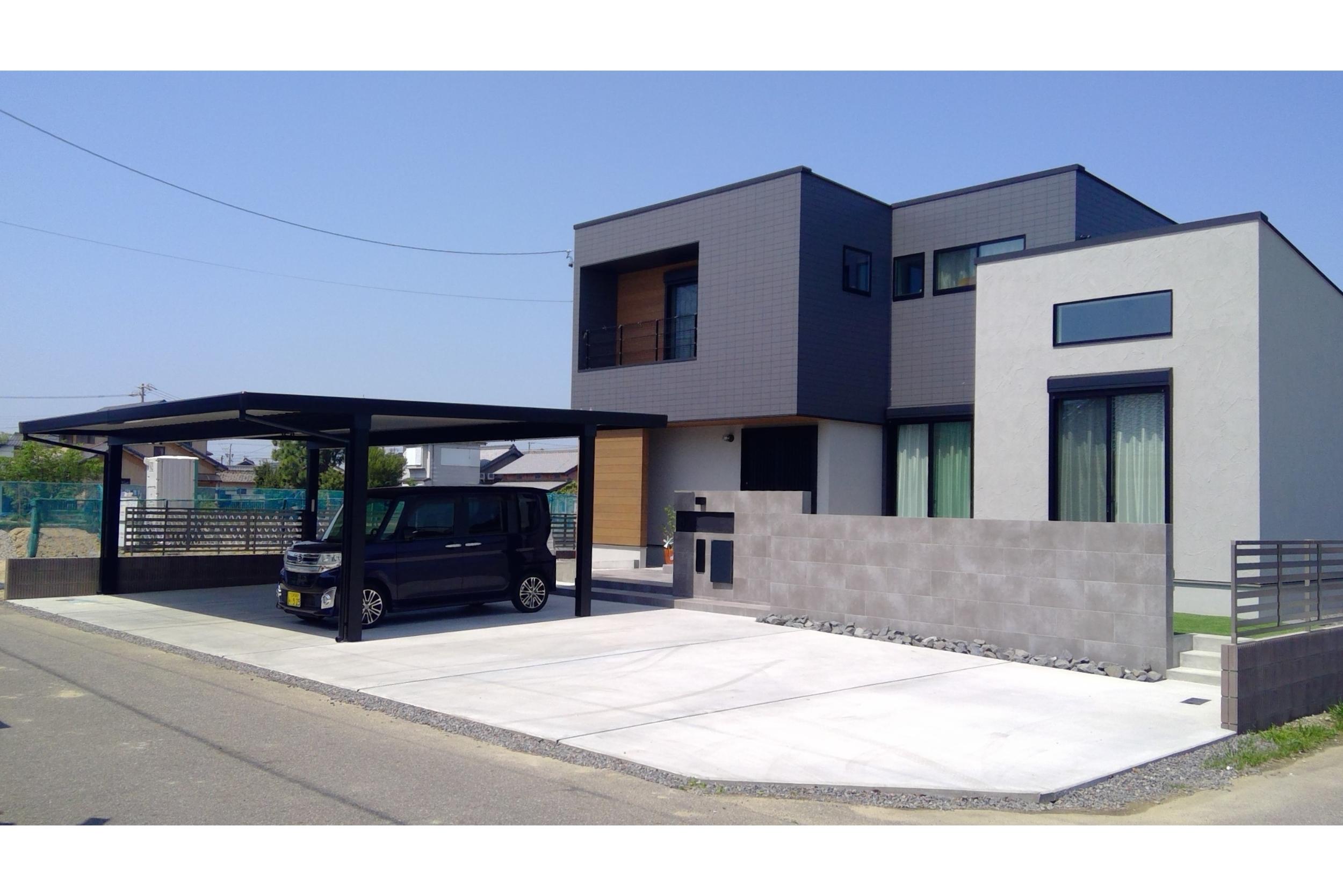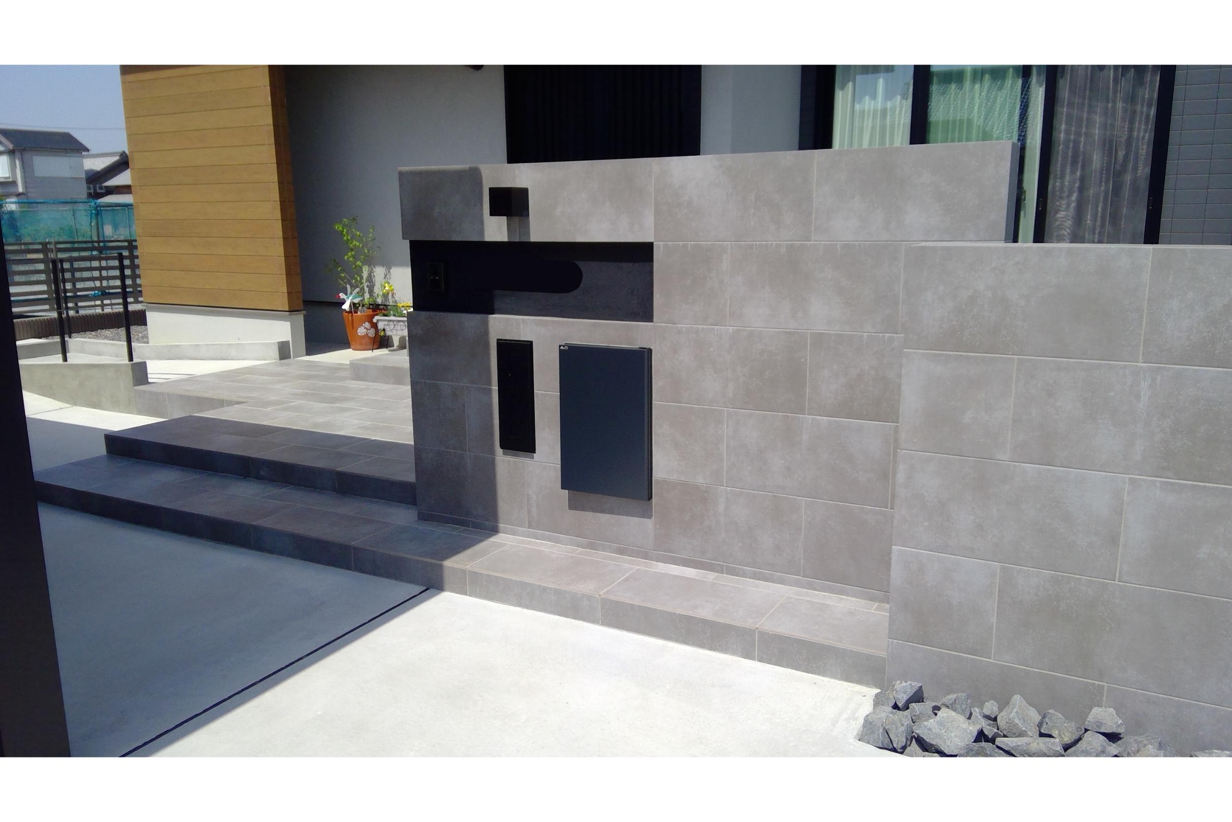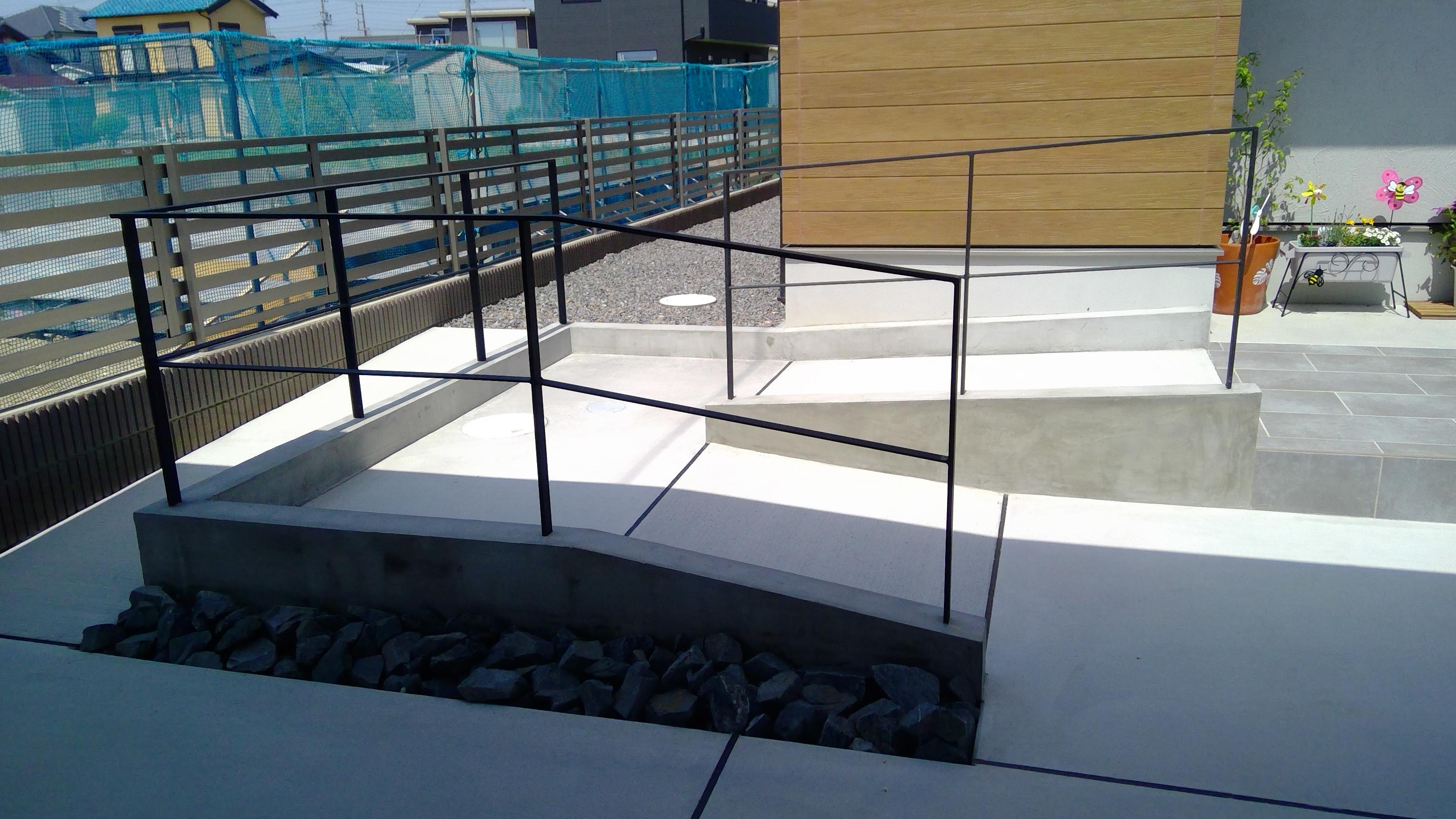 他社様で建物を建築され、外構工事を弊社にご用命いただきました。 白と黒のスタイリッシュな建物に合う外構になるように、デザインを検討しました。 こだわりのポイントは、目隠し塀の高さ設定。隠しすぎないちょうど良い高さを、現場でも打ち合わせをして決定しました!また、スロープの形状にもこだわりました!