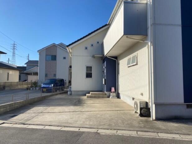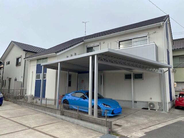 施工内容:カーポート設置リフォーム お庭の駐車スペースは常に雨ざらしで玄関まで濡れる日々から解放されました。 お客様の要望により折板カーポートにしました。 家、敷地の形状に合わせ、特注で製作し施工しました。