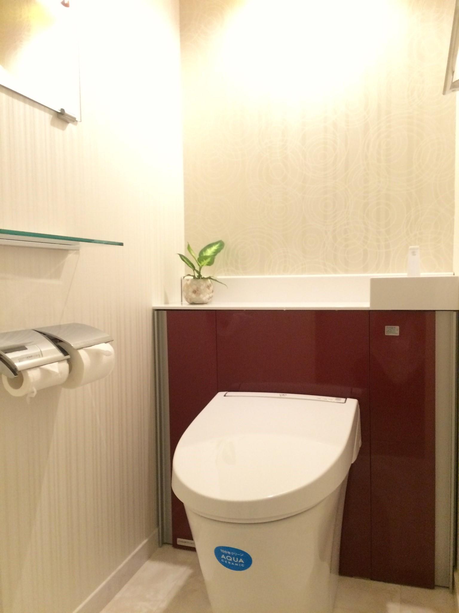 実はこれ、タンク付きのトイレなんです! タンクがないように見えますが、実はタンクが裏のキャビネットに隠されているタンク付きのトイレなんです!しかし、普段のお掃除はタンクレスのトイレと同じようにほこりが奥までたまりにくく、簡単に床もお掃除が出来るので、タンクレスにしたいけどちょっと難しい…とお考えの方にお勧めです。 トイレ内の収納も、キャビネットの両側に予備のペーパーやトイレブラシが収納出来て、紙巻器の上には飾り棚としてガラス棚を取付けて収納量を増やさせていただきました。 床材には大建工業のトイレタフを採用。傷はつきにくくアンモニアにも強い素材で覆われているフローリングで、見た目はいつもつやつやです。 お客様がとてもデザインにこだわりのある方で、よりリラックス出来る空間づくりのお手伝いを、お客様のご要望に合わせてご提案させて頂きました。