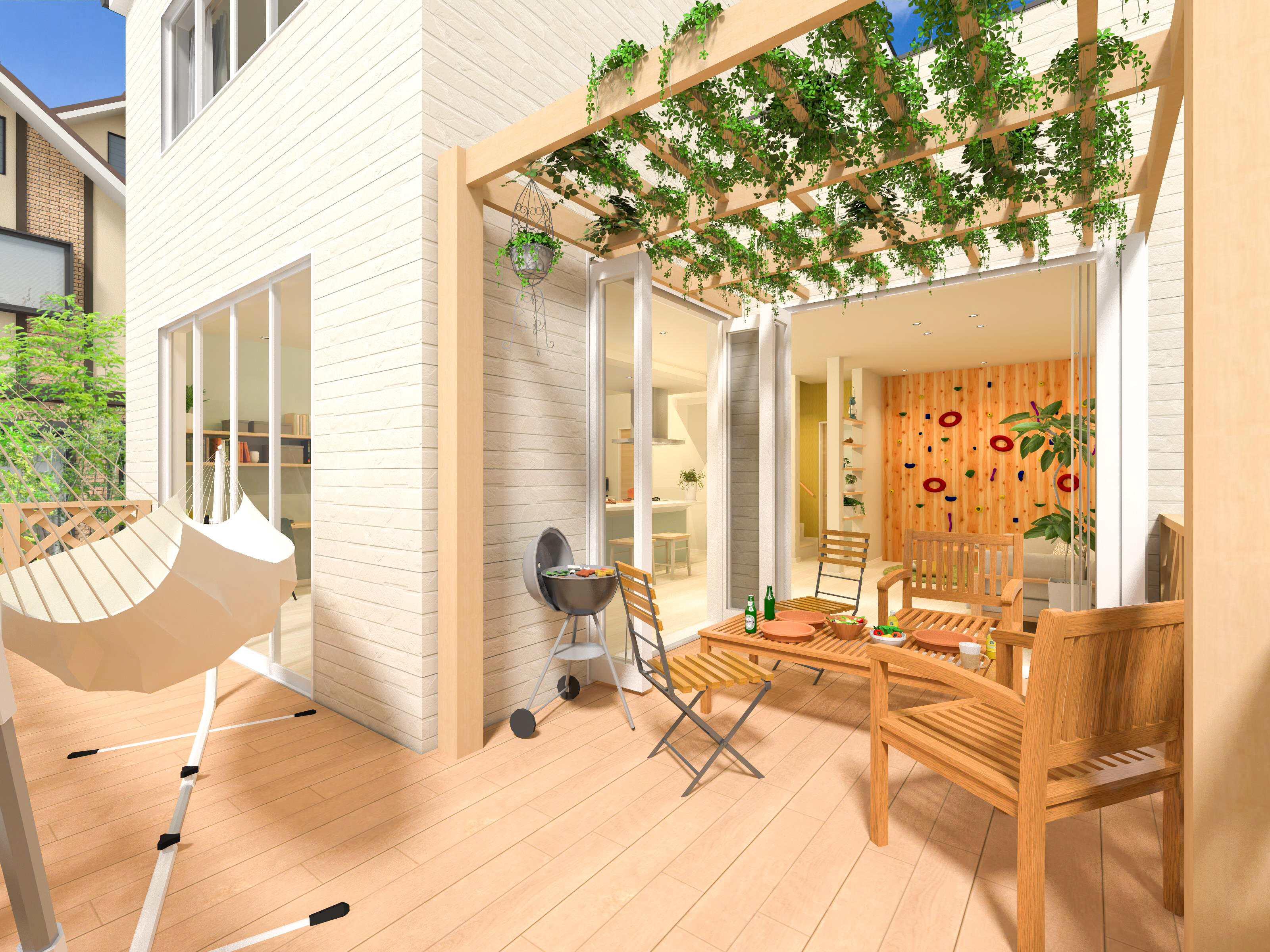 元々庭であったスペースにウッドデッキを設置し、テラスに。LDKと同じ高さにすることで屋外との一体感を創出。テラスではBBQやプールを楽しめ、ハンモックを取り付ければ日常生活の中で気軽にリフレッシュができる場所に。