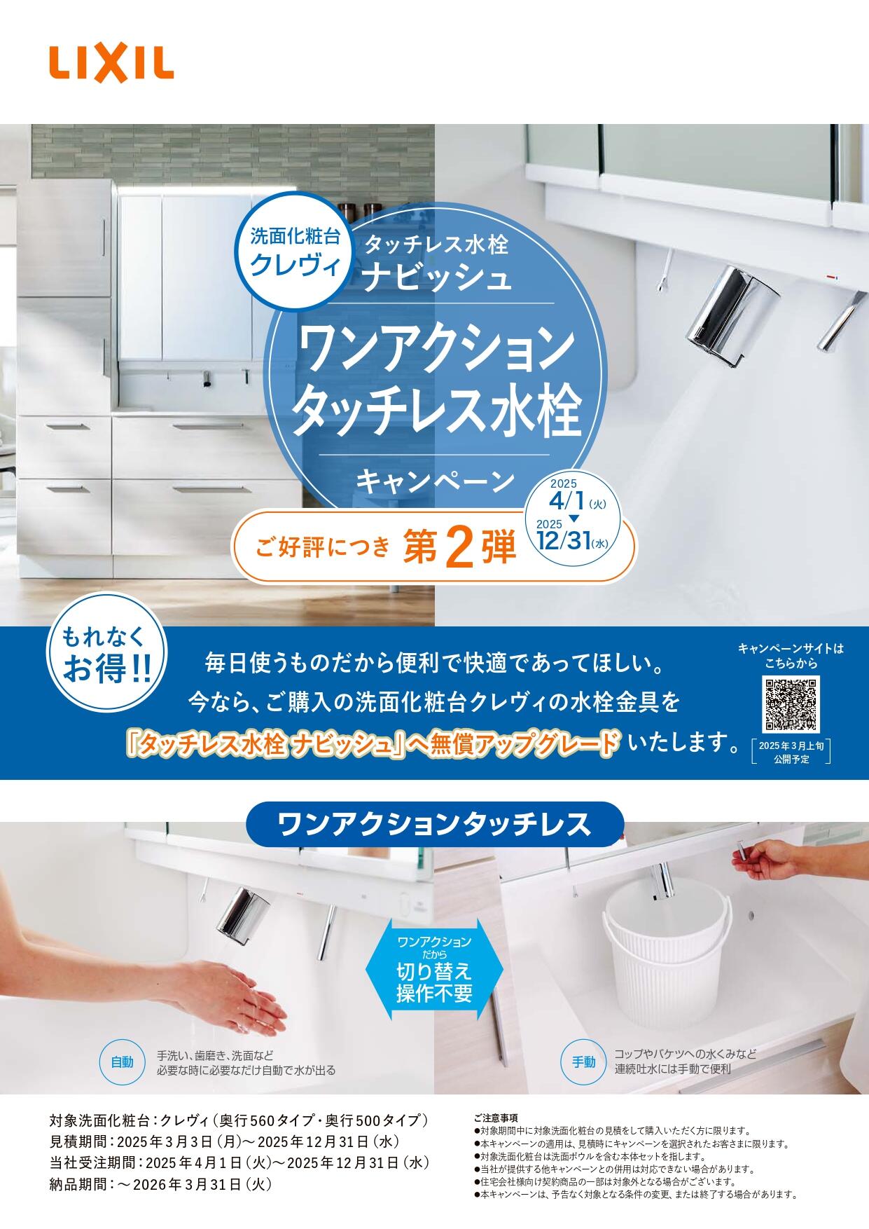 現在のキャンペーン期間中に「クレヴィ」をご購入いただくと、タッチレス水栓「ナビッシュ」へ無償アップグレードいたします。 -
