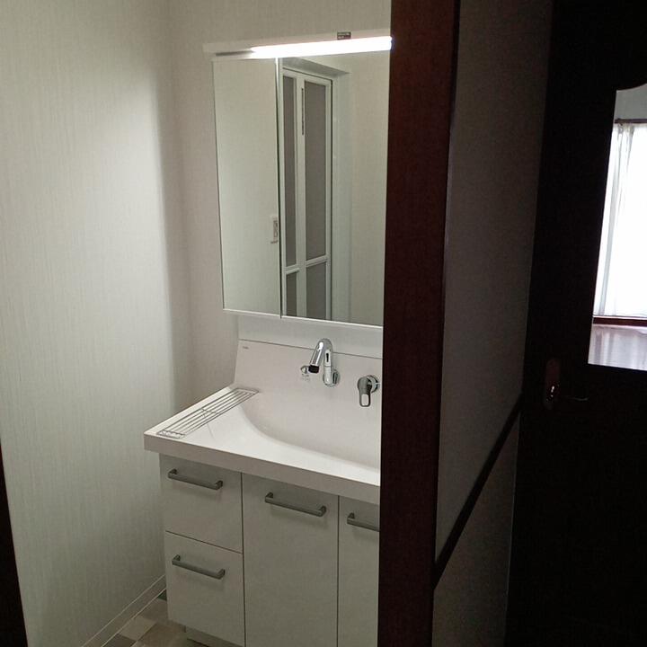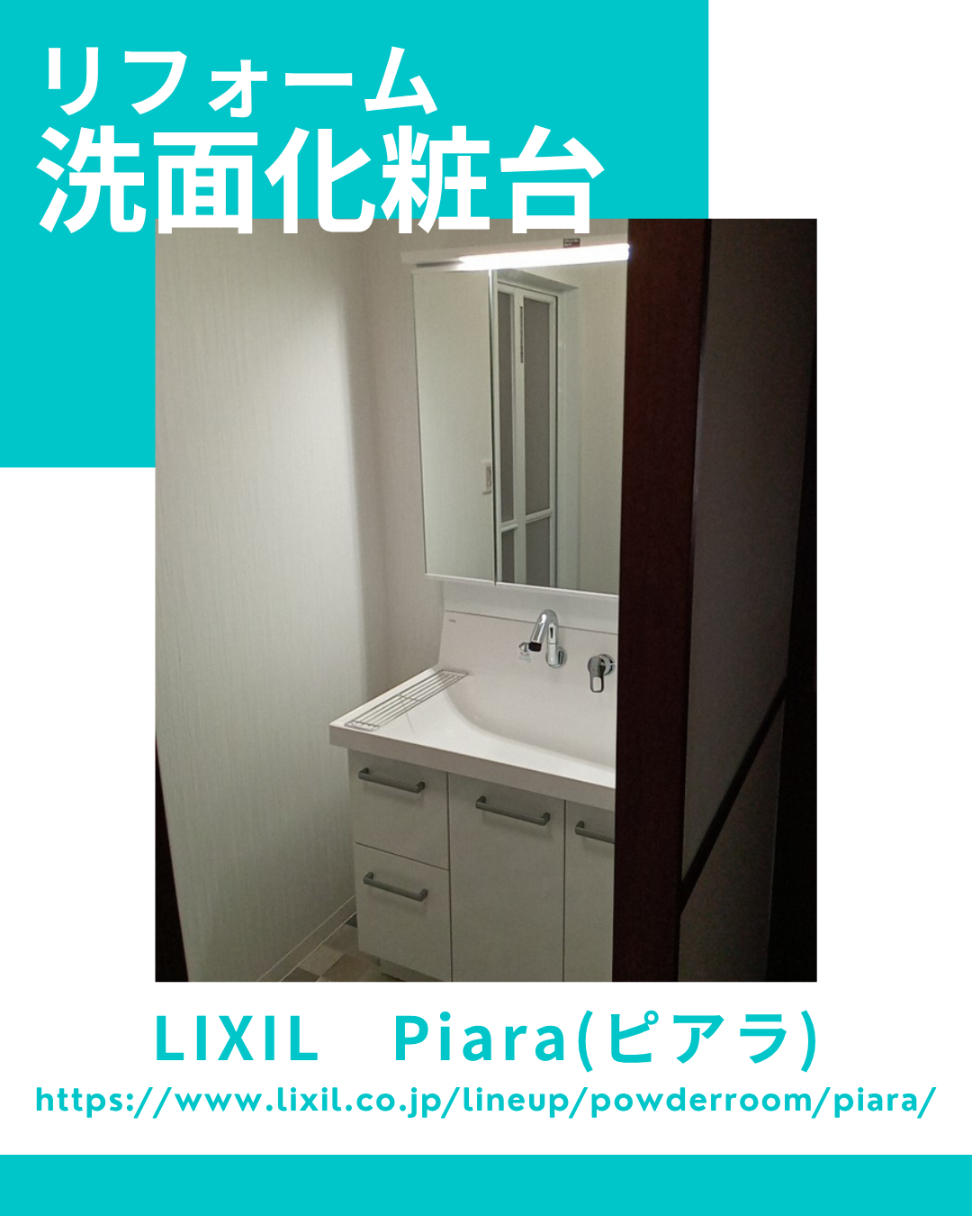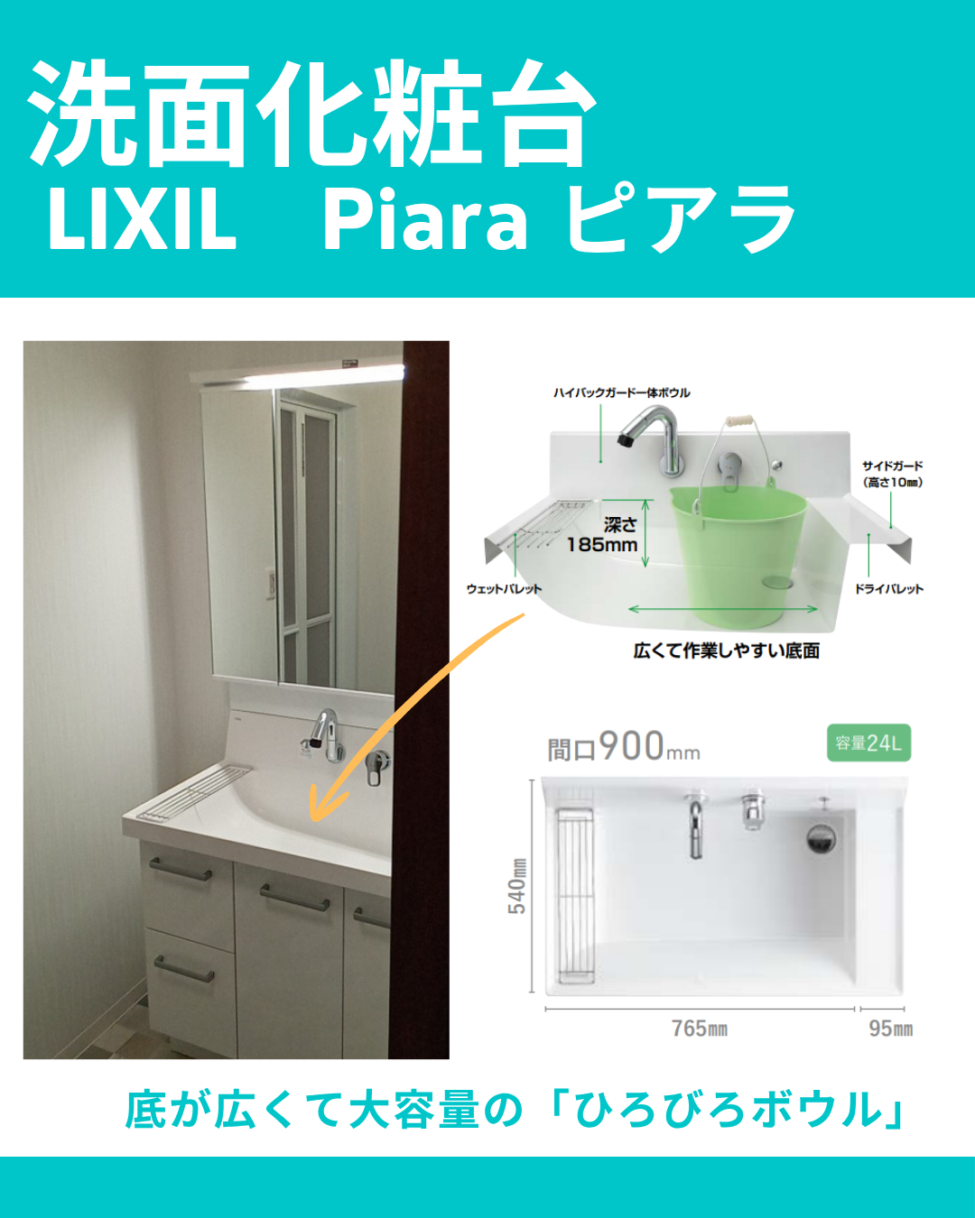 洗面化粧台のリフォーム。今回はw900ピアラをお選びいただきました。 既存のものより、広く深くなったボウルは広くて深く、作業しやすい形状です。 水栓もくるくる回るので、並んでの身支度などもスムーズに使用する事ができます。