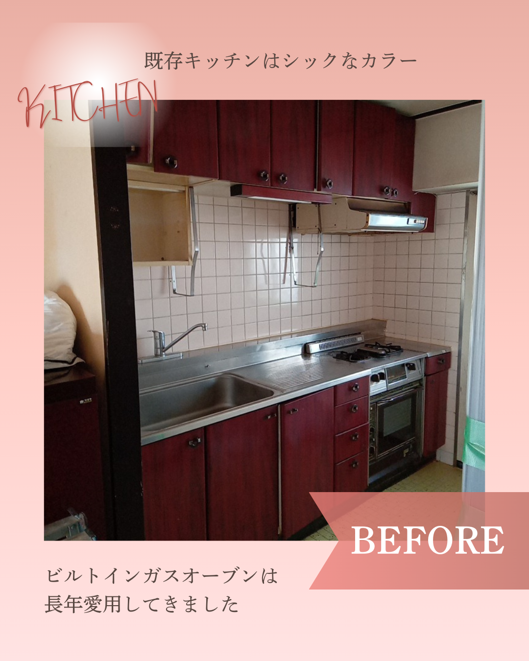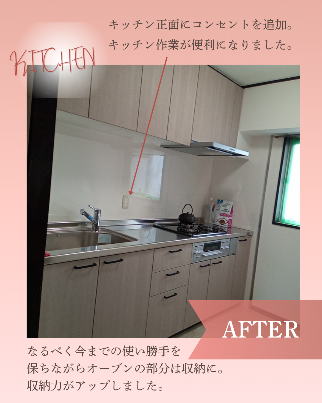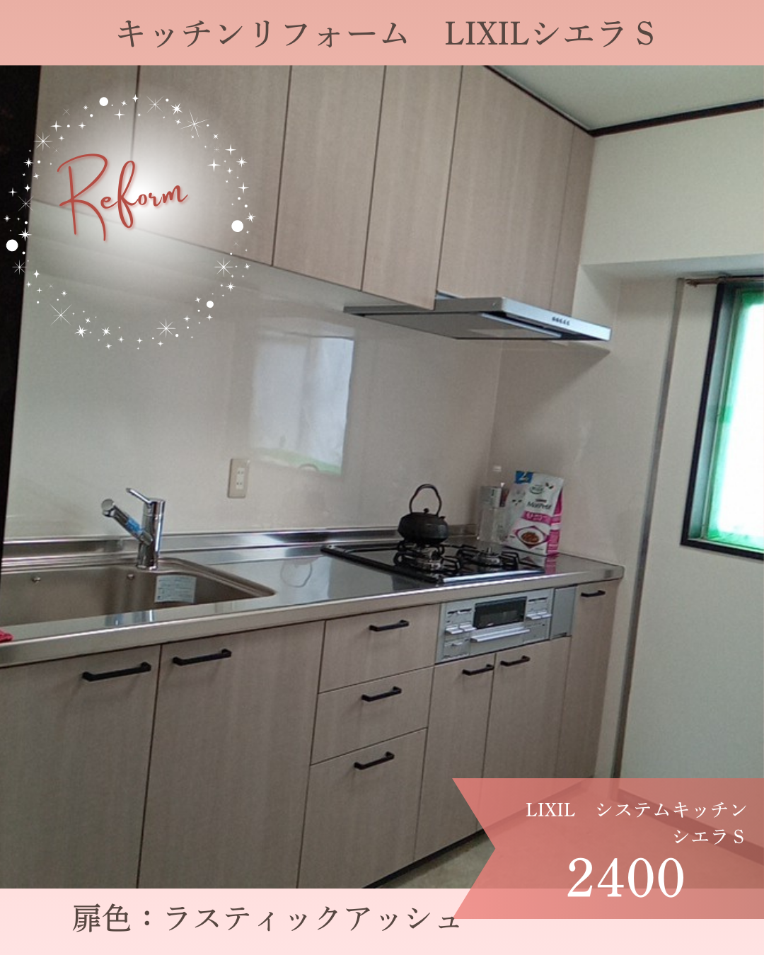 システムキッチン シエラSへのリフォームです。間口2400 既存のキッチンはシックで高級感のあるカラーでしたが、リフォーム後はお部屋を明るくみせてくれる明るいカラーに変身しました。 愛用のビルトインオーブンは、ライフスタイルとともに使う回数も変化し、リフォーム後は収納に変わりました。 今までの使い勝手を保ちながら、収納アップ、機能的なキッチンになりました。