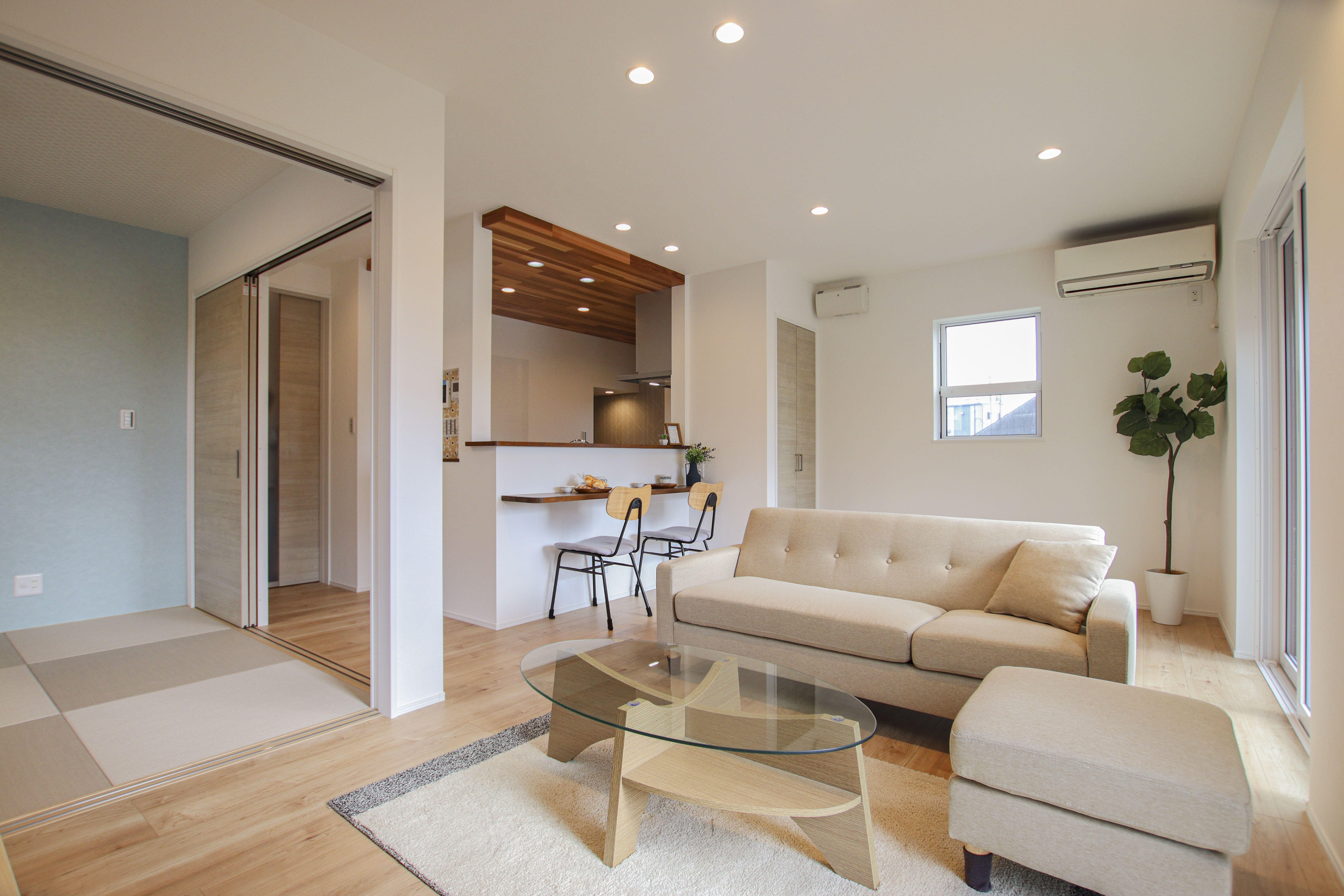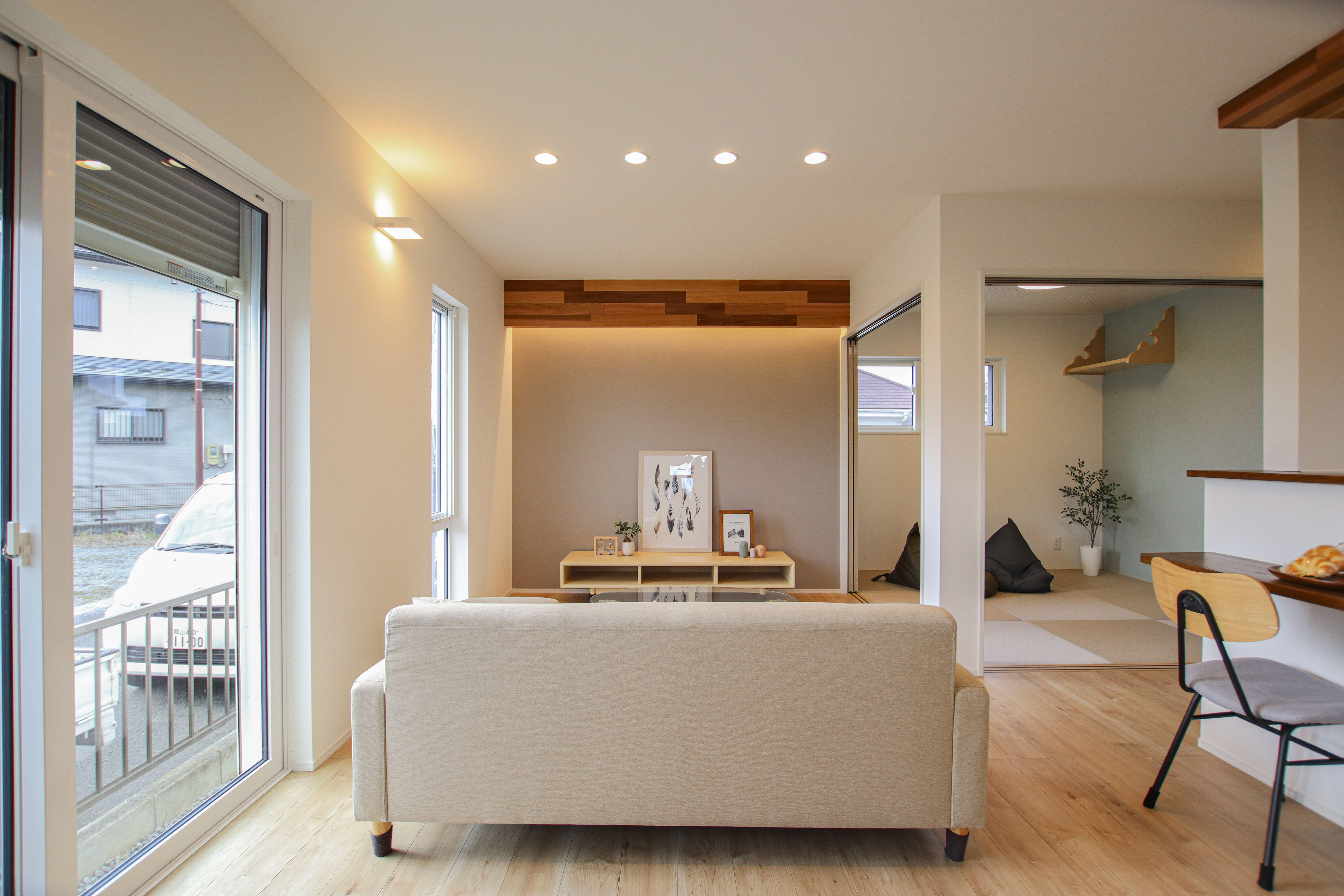 もともとは西に面して大きな窓が配置されていたリビングは、日光の取入れも難しく冬場の冷気で室内がなかなか暖まらないため居住性に不便を感じていましたが、思い切って配置をガラリと変えて、西面には小さな窓、南面に掃き出し窓と採光用のスリット窓を設置することで、明るい日差しの差し込むあたたかく快適なリビング空間になりました。