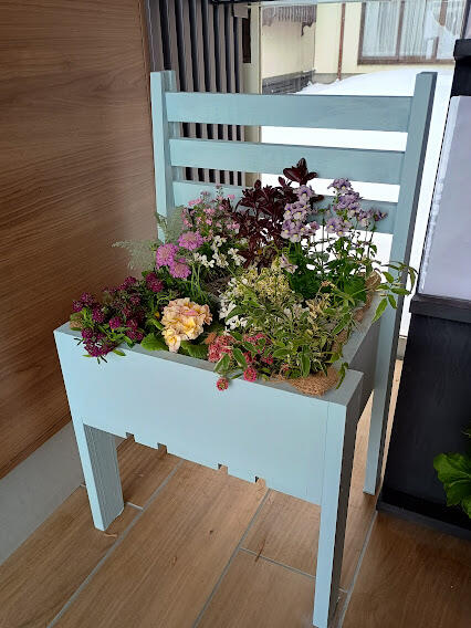 ちなみにブルーグレーの椅子はプランターになっています。自社の大工さんに作ってもらったのですが、女子たちに好評ですので今後のイベントで登場すると思います。