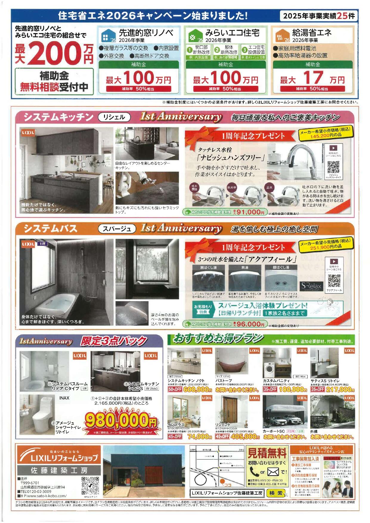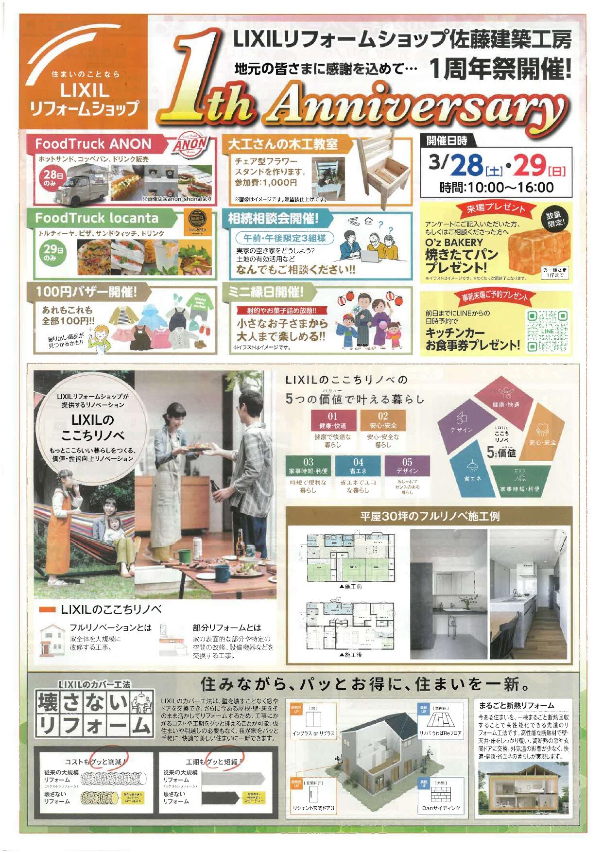 3月28日(土)29日(日)の2日間、LIXILリフォームショップ佐藤建築工房におきまして「1周年祭 ファーストアニバーサリーイベント」を開催いたします。時間は両日とも 10:00から16:00です。