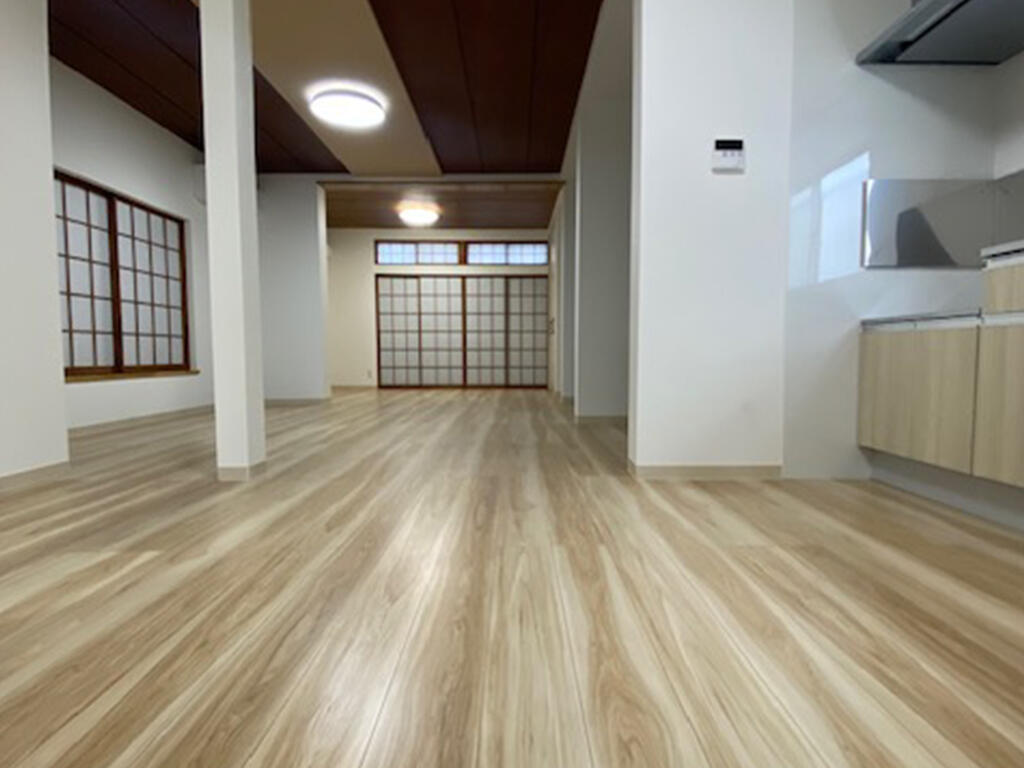 お施主様のご意向を元に、なるべく低予算で暮らしをアップデート。 日本家屋の落ち着いた雰囲気を残しながら、バリアフリーのフローリングへとリフォームすることで、明るく開放的な空間が生まれました。 掃除もしやすく、お子様やペットにもやさしい床へ。 暮らしの快適さを一段アップさせる、そんな住まいです。