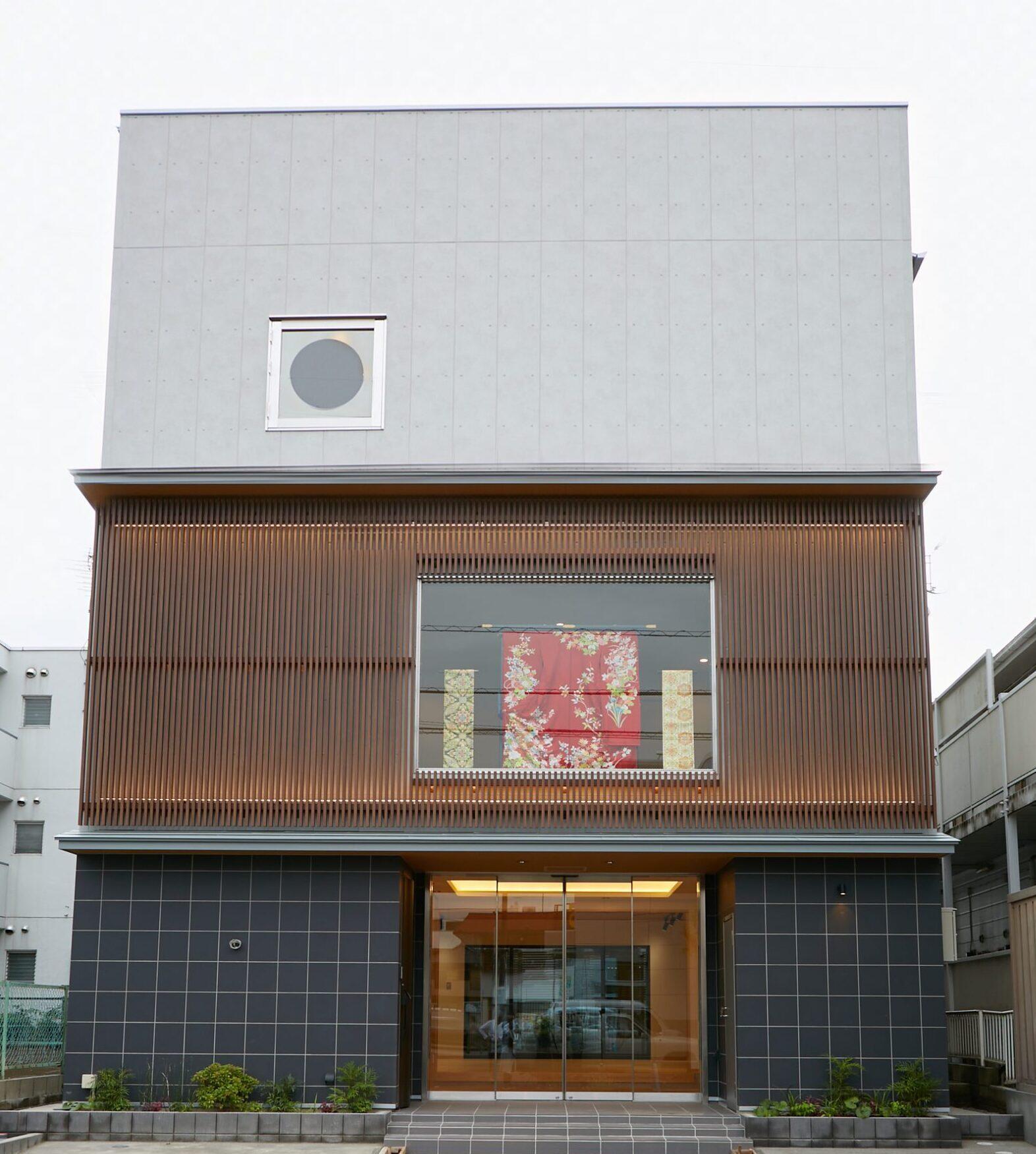 四季折々の美しいお着物を展示した大きなショウウインドーと機能性の高いRC調サイディングをベースとしたシックな外観がポイントです。
