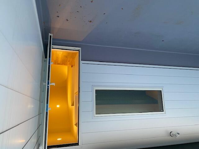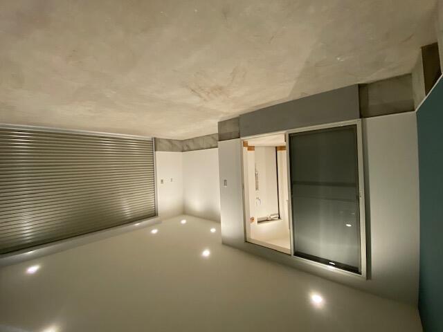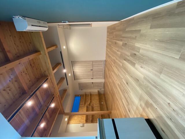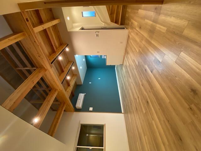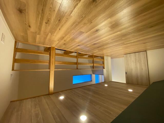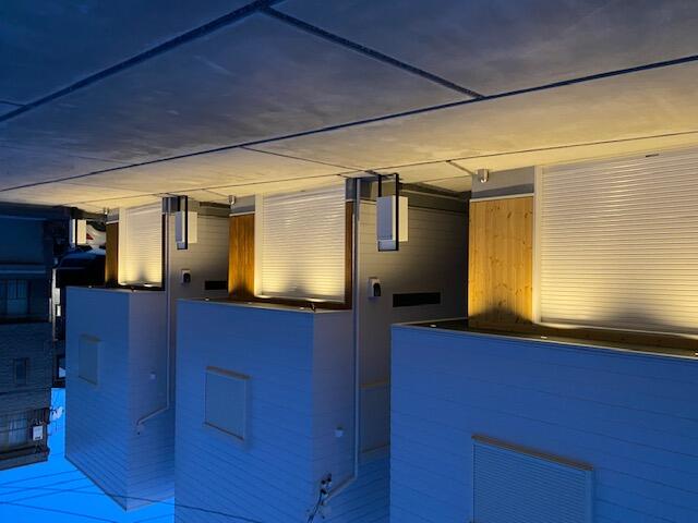 三棟並んだ木造二階建賃貸のガレージハウス、群青の宵に浮かび上がった白い外観が美しく印象的です。 1Fのガレージは車庫としての利用だけではなく趣味のスペースやトレーニングルームとしてなど、使い勝手抜群。 居室はあたたかみのある無垢素材を贅沢に使用し、家中どこにいても光と風を感じられる気持ちのいいつくりになっています。