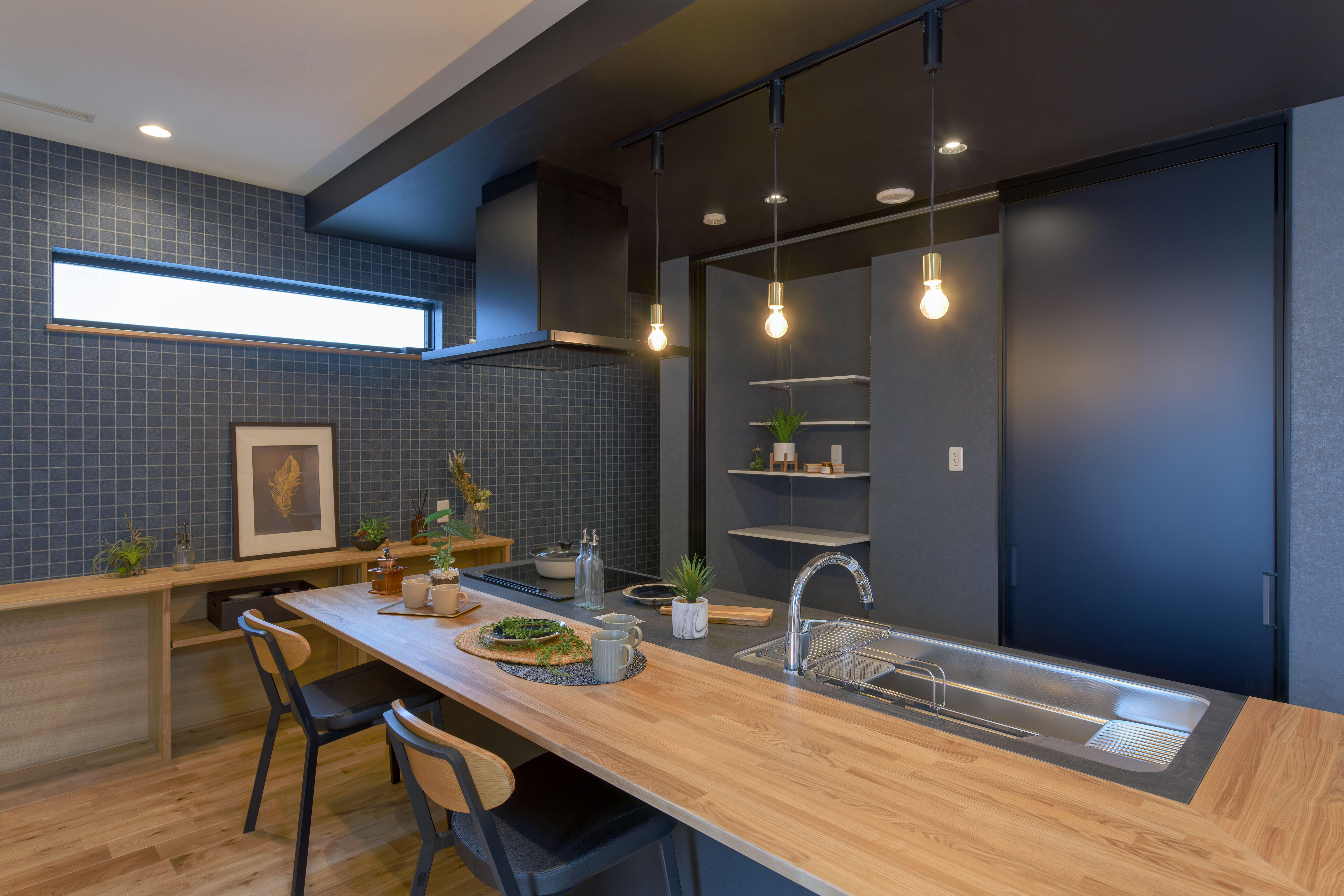 奥様こだわりのカウンターと一体化したキッチンは、家事効率とおしゃれを両立。