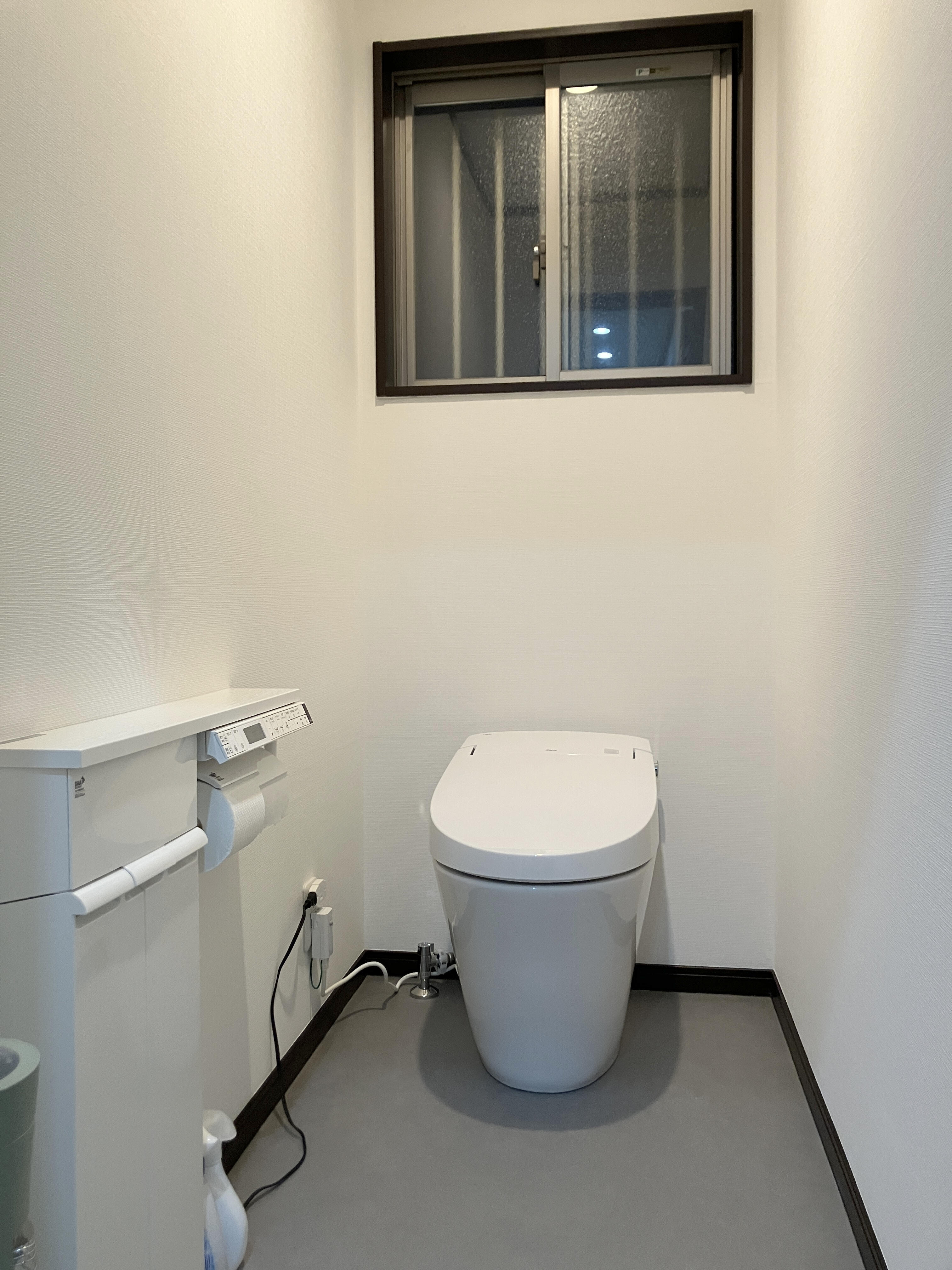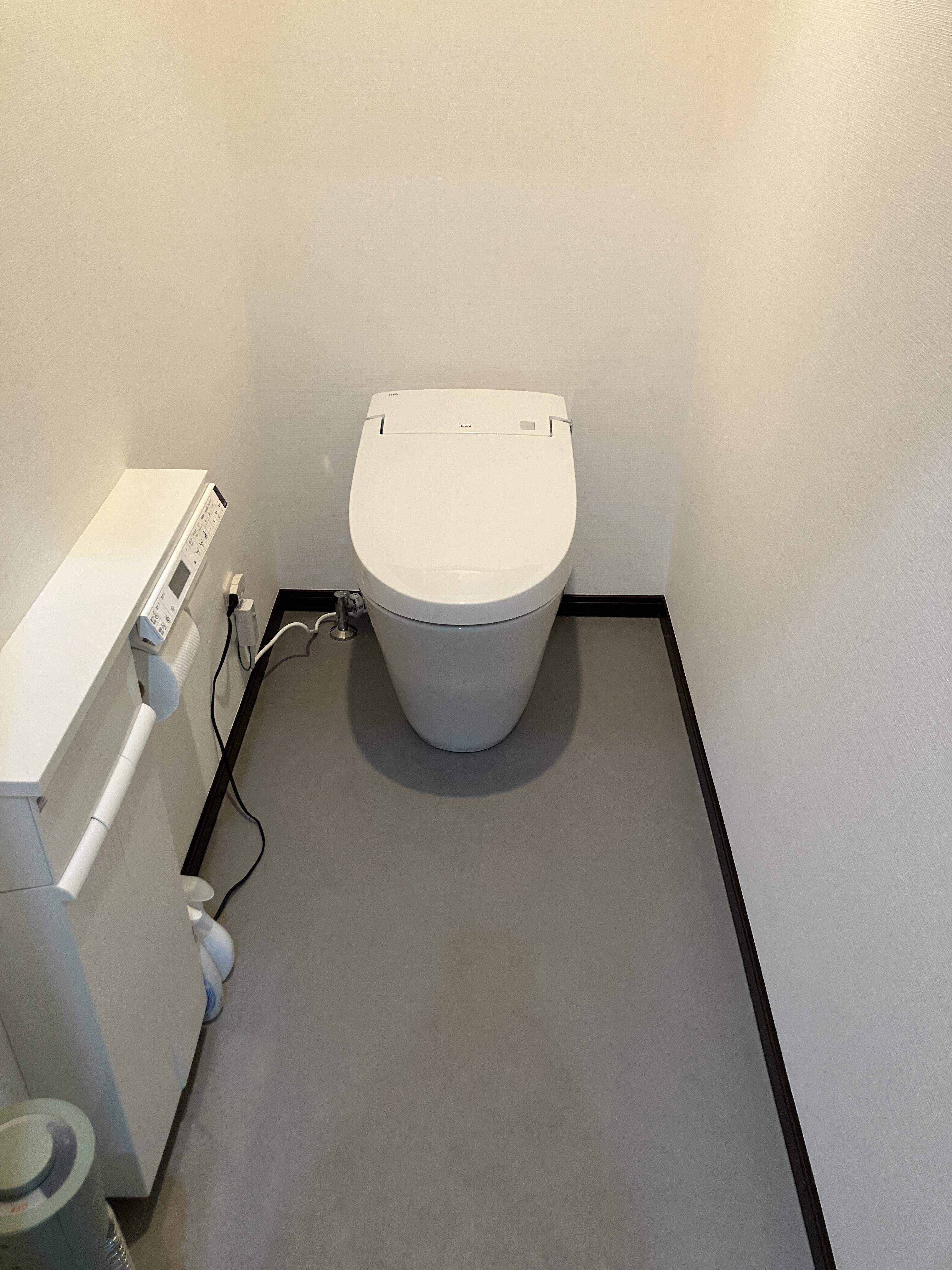 タンクレスにすることでトイレ空間がすっきりとし、圧迫感のない広々とした印象に。 デザイン性と清掃性を兼ね備えた、清潔感あふれるトイレリフォームが完成しました。