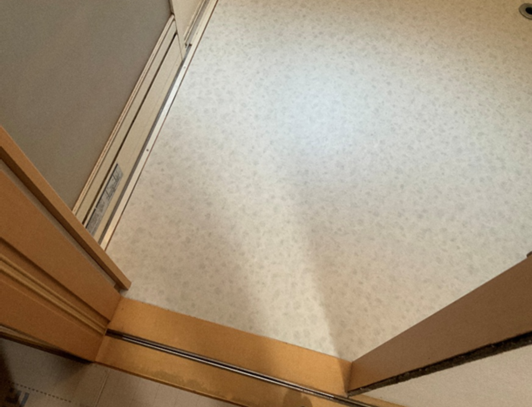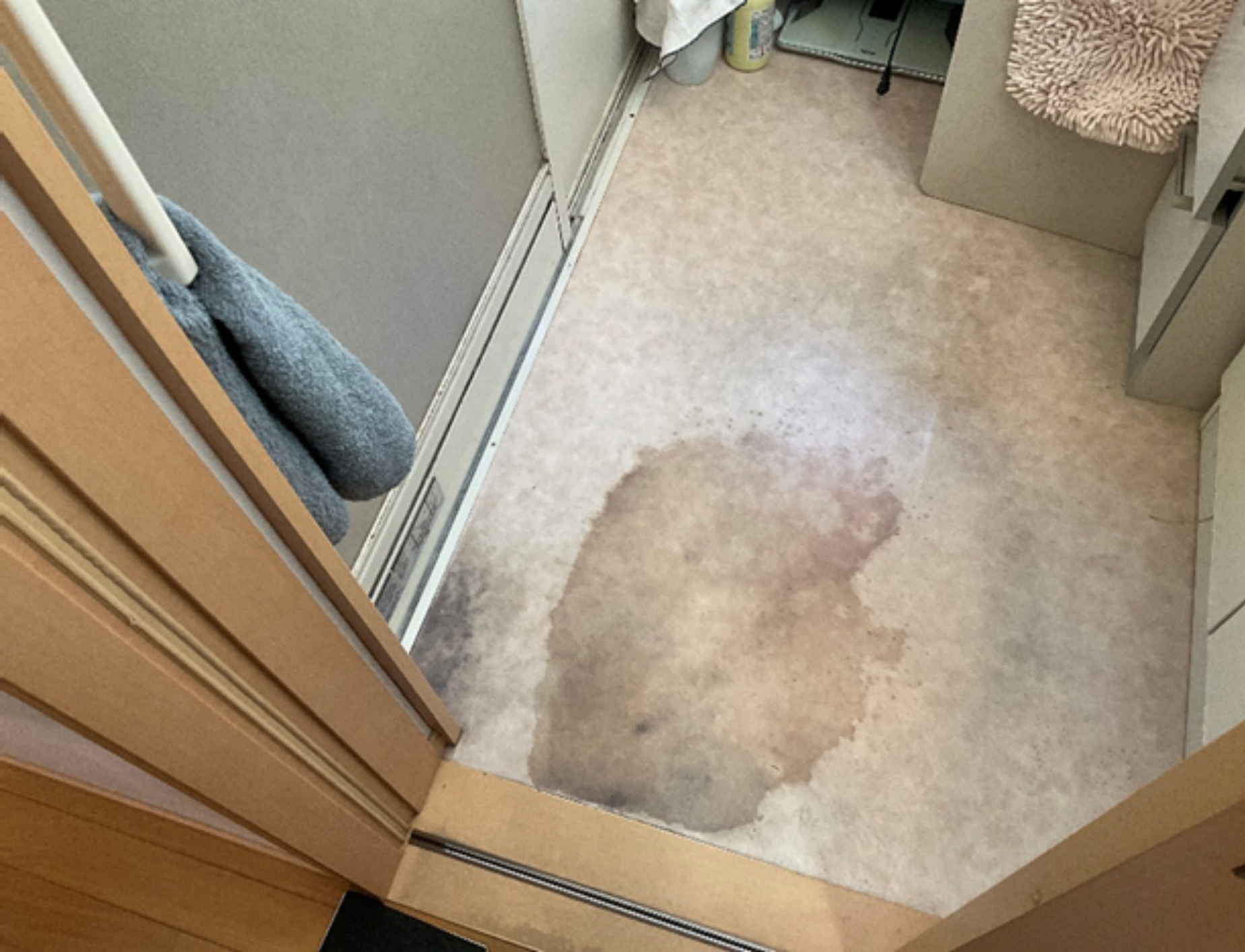 浴室と脱衣場が段差のないフラットな構造のため、入浴後に浴室側から水が侵入し、脱衣場の床が徐々に劣化してきたことからご相談をいただきました。