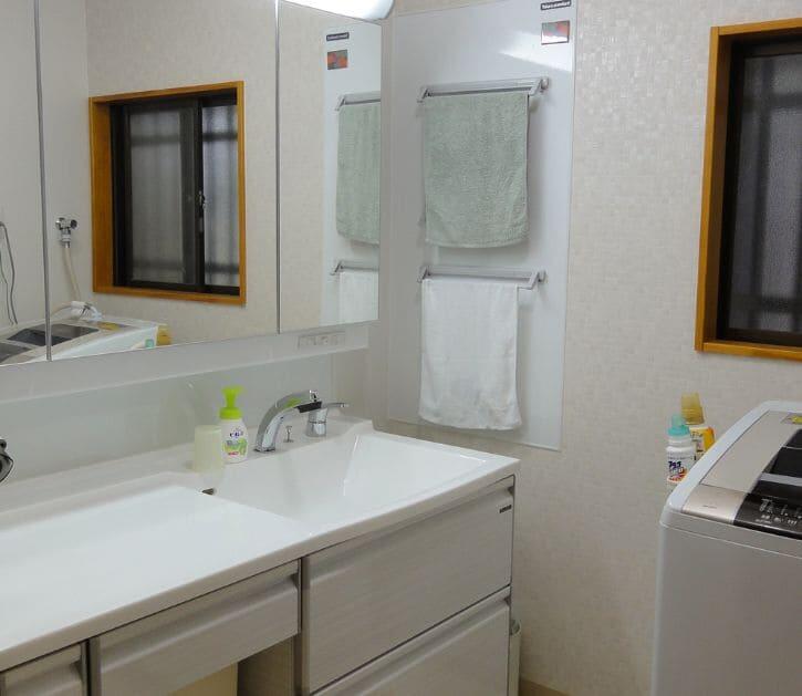 明るい洗面室になりました。 お客様は「うす暗い洗面室を明るく清潔感のある空間に変えたい。」というご要望でした。 洗面室の空間を増やすために部屋の解体を行い洗面室を広げました。 結果、洗面室が広くなり明るく開放的な空間提案が行えました。