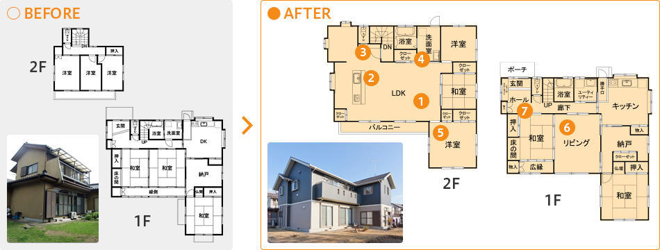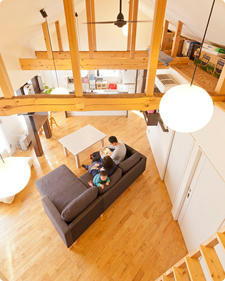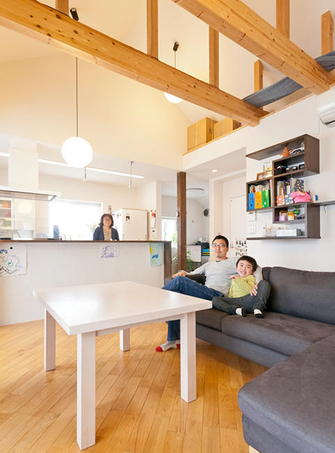 夫婦2人だけになって寂しそうにしていた両親に、二世帯同居を提案。実家をリフォームして、親子3世代が住める家に。2階の床面積を約40%も増やす大幅な増築を施し、吹き抜けとロフトのある広大な空間を実現しました。