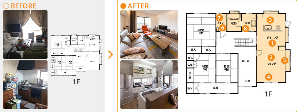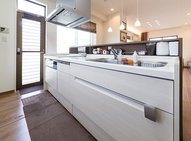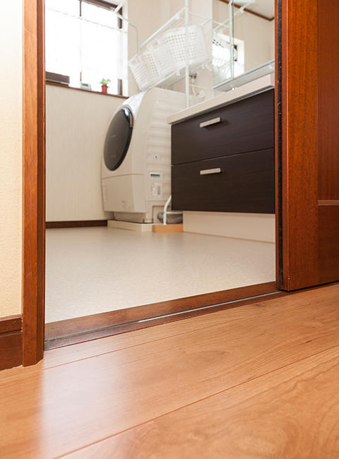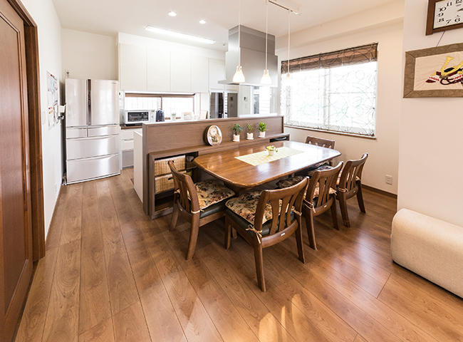 リビングとダイニングキッチンを隔てていた壁を取り払い、奥様念願の対面式キッチンを導入。調光ができるLED照明を配置して、生活シーンに合わせた使い方ができるよう工夫しました。さらに、部屋と廊下の段差を無くしバリアフリー化も。ご高齢のお母様も安心して暮らせる家が誕生しました。