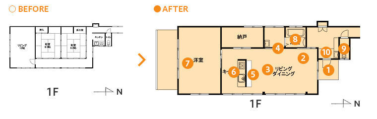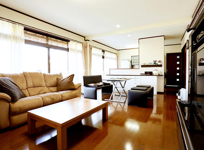 ふたつの和室をひとつの大きなリビングに統合し、キッチンやトイレなどの水回りを移動。少なかった収納を増やすため、納戸も設けました。全室にわたって断熱材と二重ガラスのアルミサッシを採用し、暑さ寒さも改善しています。