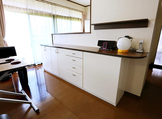 以前は収納がほとんどなく、どの部屋も物で溢れており、ゆっくり安らげる空間がありませんでしたが、広いリビングができたことで、落ち着いて暮らせるようになりました。「食べて寝るだけ」の家から、「暮らせる家」に変化したと感じています。休みのたびに出かけていた趣味のドライブも、リフォーム後は頻度が減りました。和室から洋室になってカーテンがついたことで、プライバシーの面でも、落ち着けるようになったのでしょう。高齢の両親が、2階建ての母屋で暮しづらくなったときには、私たちが母屋に移って、ここに住んでもらうことも考えています。