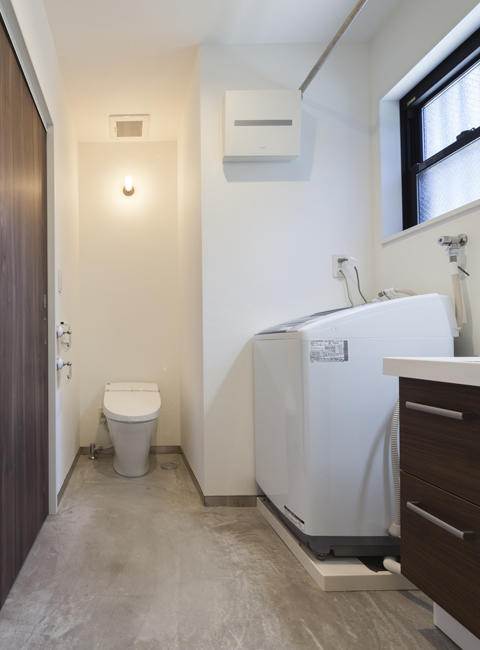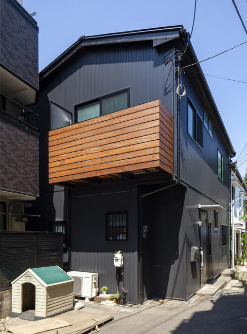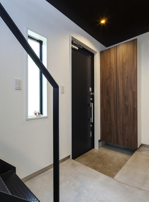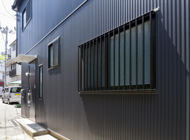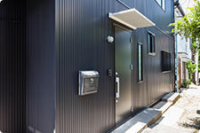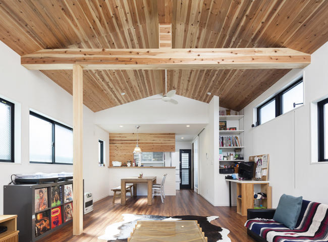 ガレージのような雰囲気を実現するため、外観はモノトーンのトタン風を選択。2階のリビングの天井には、特徴的な「船底天井」を採用して、開放感な空間を生み出しました。また、床や天井には、お子さんたちの身体にやさしい自然素材の木材を採用しています。