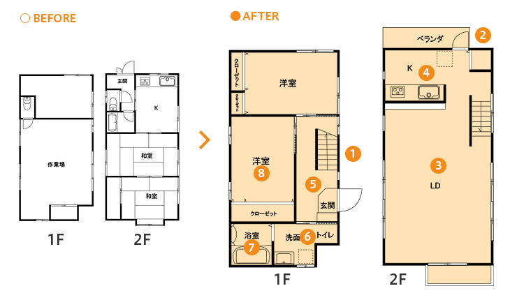 工房だった1階と、外階段でしか上がれなかった2階を、屋内階段で行き来できる、ひとつの住居に統合。2階は、ふたつの和室の間の壁を取って広いリビングに。1階に夫婦の寝室と子ども部屋、水回りを配置しました。