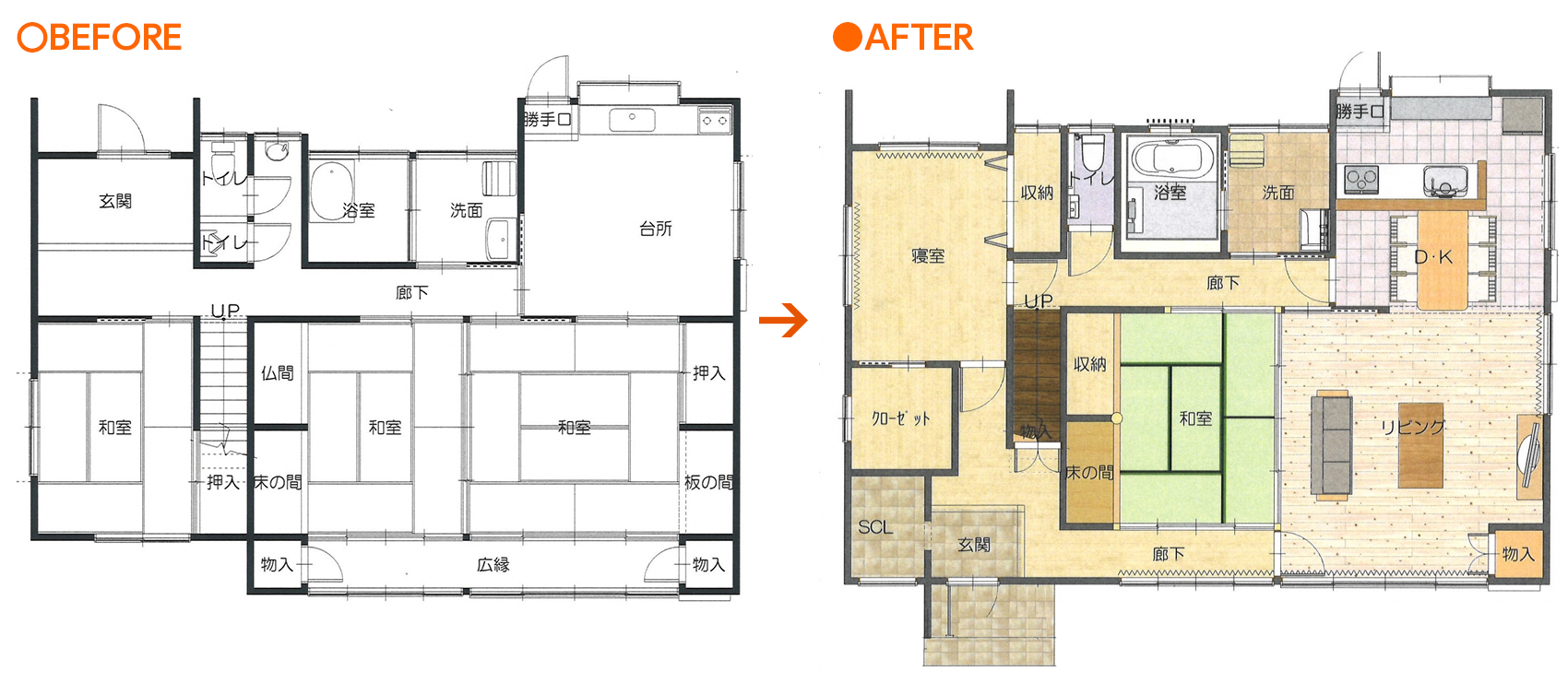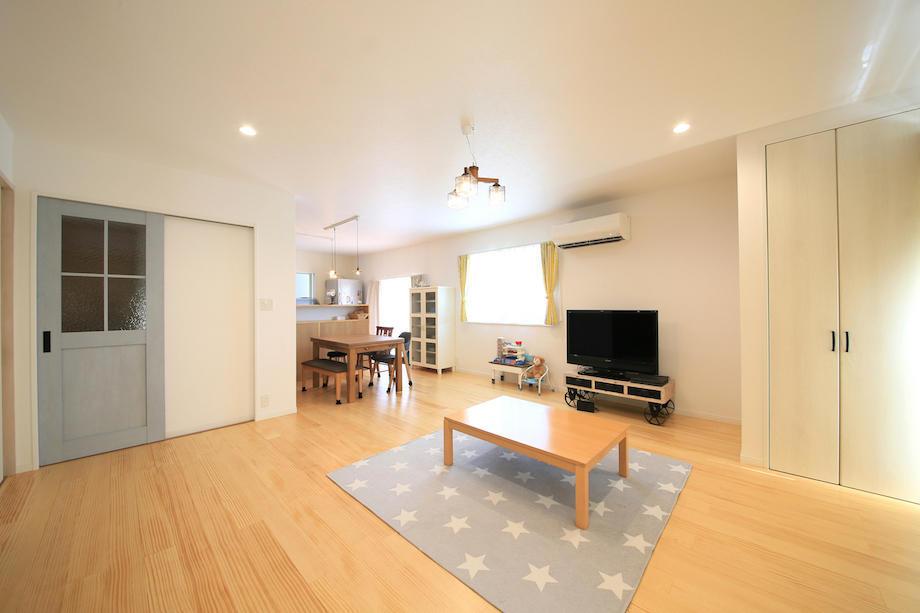 元々あった台所と和室の間仕切りを外し、広々としたLDKへ。家全体もバリアフリーで掃除が容易になった。 毎日使う水廻り設備もアクアセラミック仕様のトイレ、キッチンのIH等、掃除のストレスを軽くする商品を設置した。