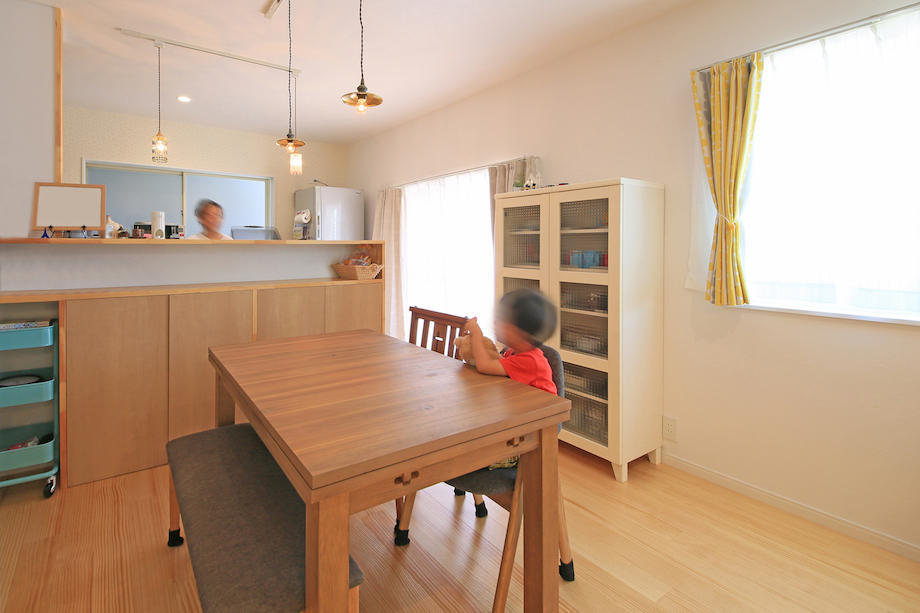 北欧風のパステルカラーで統一されており、室内全体が明るく、広く感じられる。また対面キッチンなのでお子様にも目が届き、双方が安心できる。