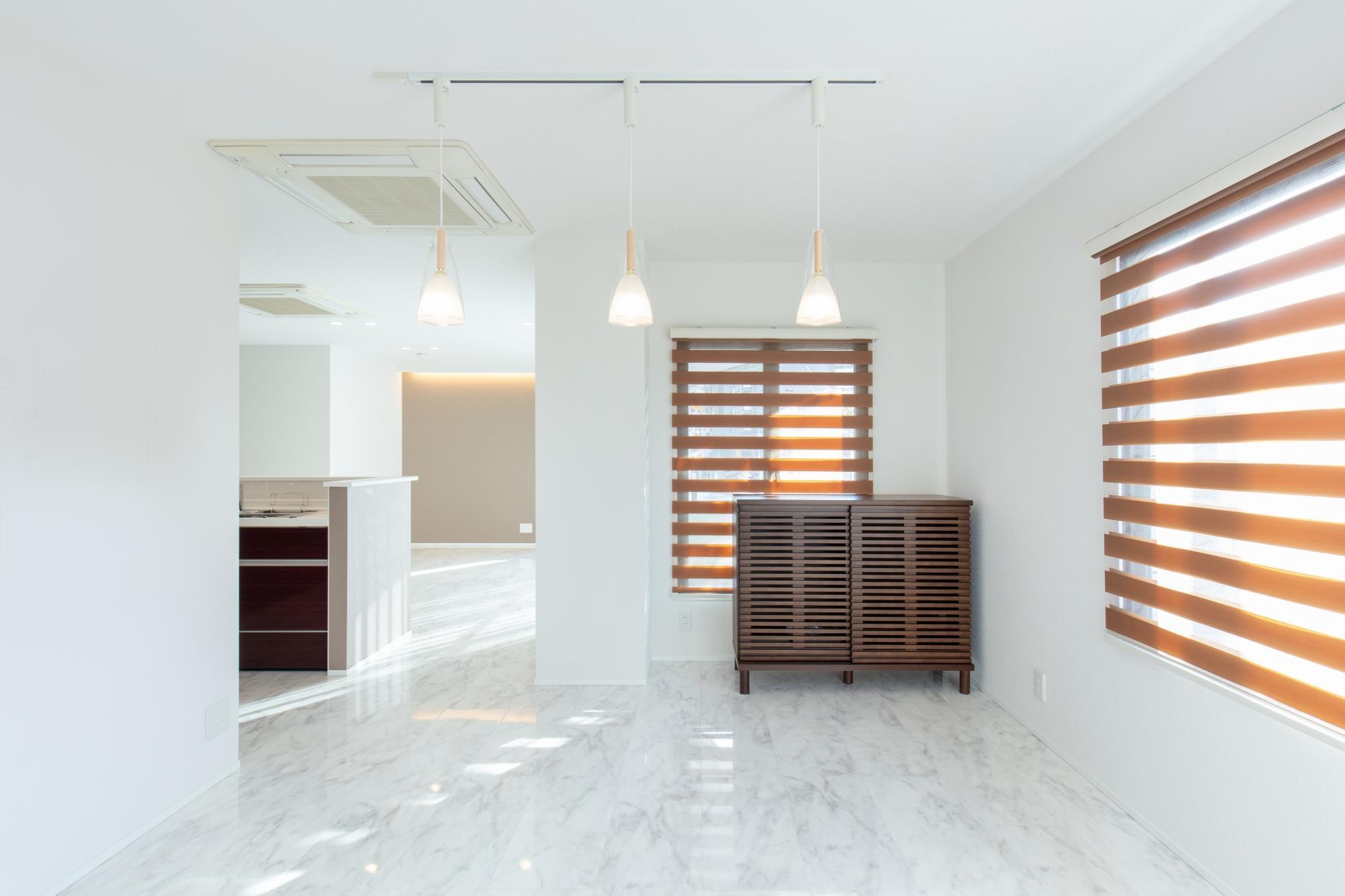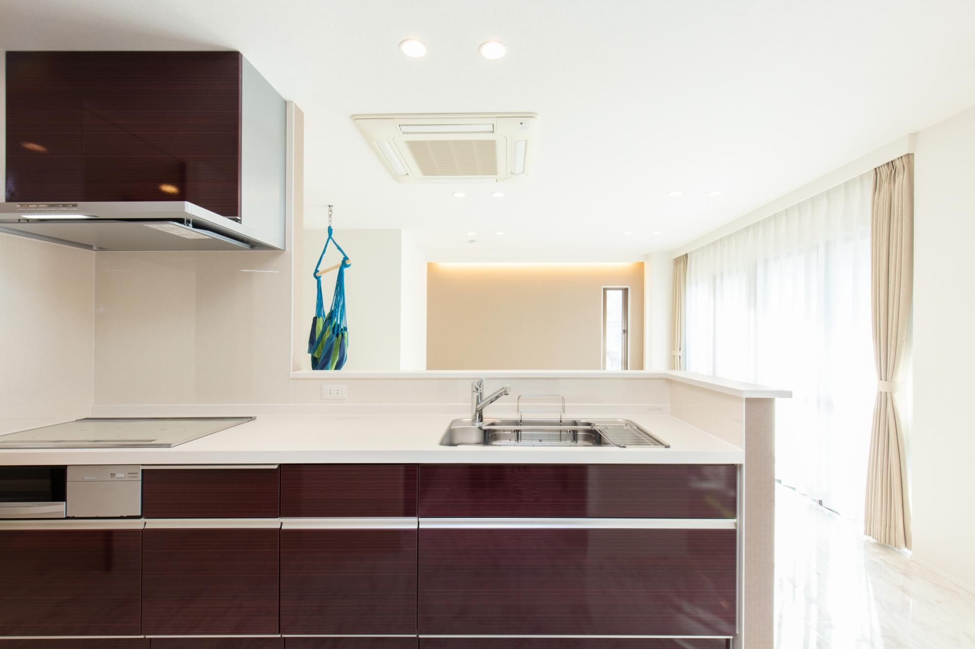 キッチンを家の中心に配置し、家事動線に配慮しています。 回廊型にする事で、無駄なスペースを最小限にすると共に、壁も減らし、どこにでも最短ルートで移動できます。