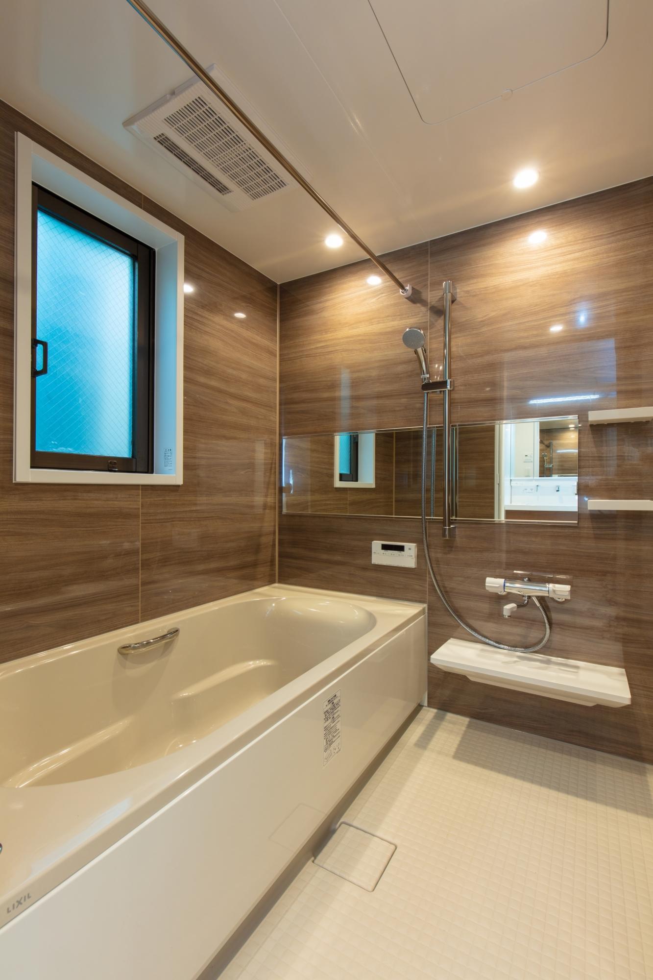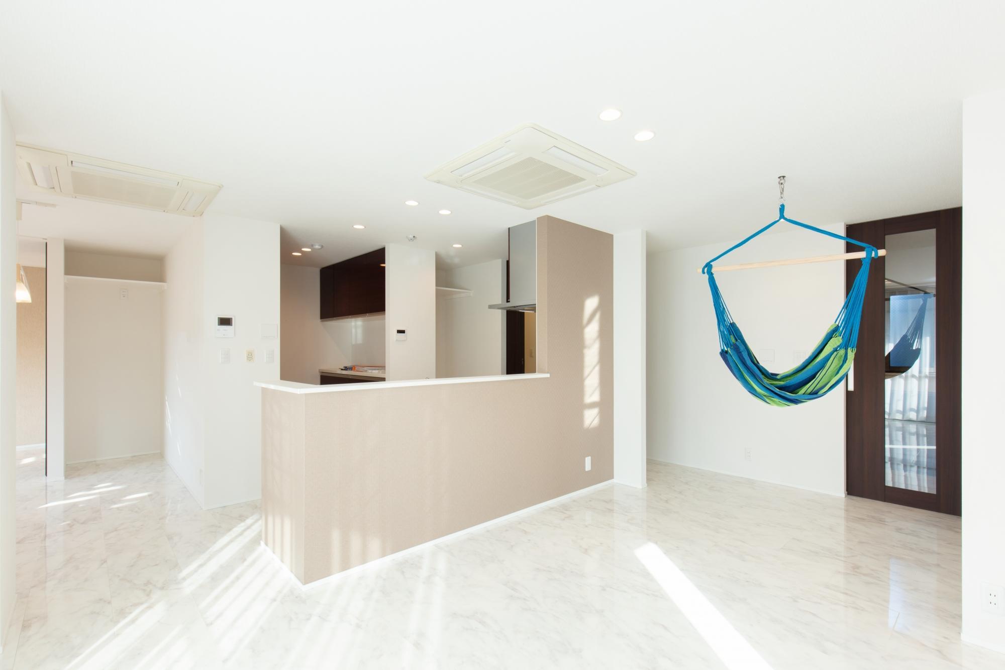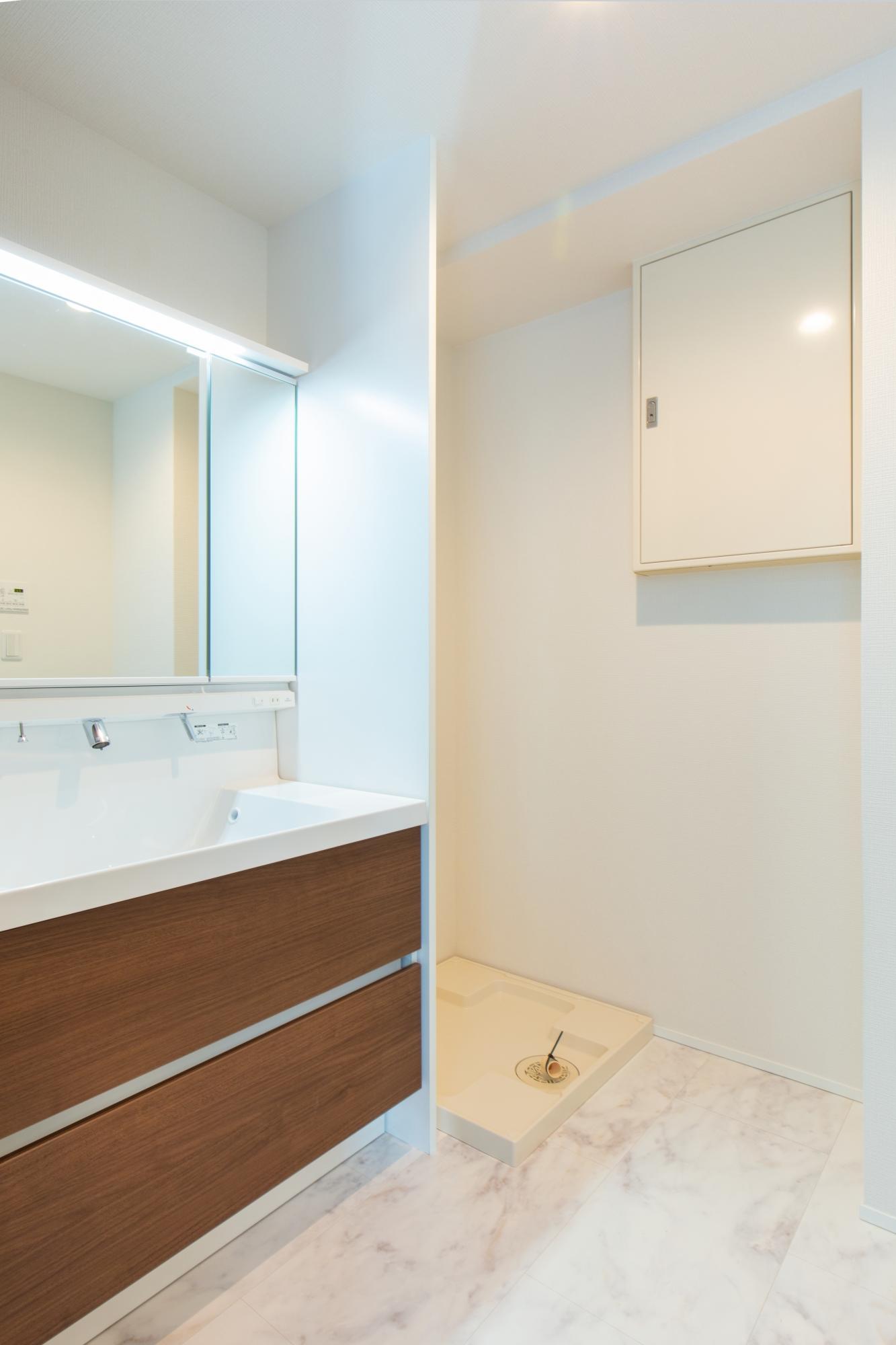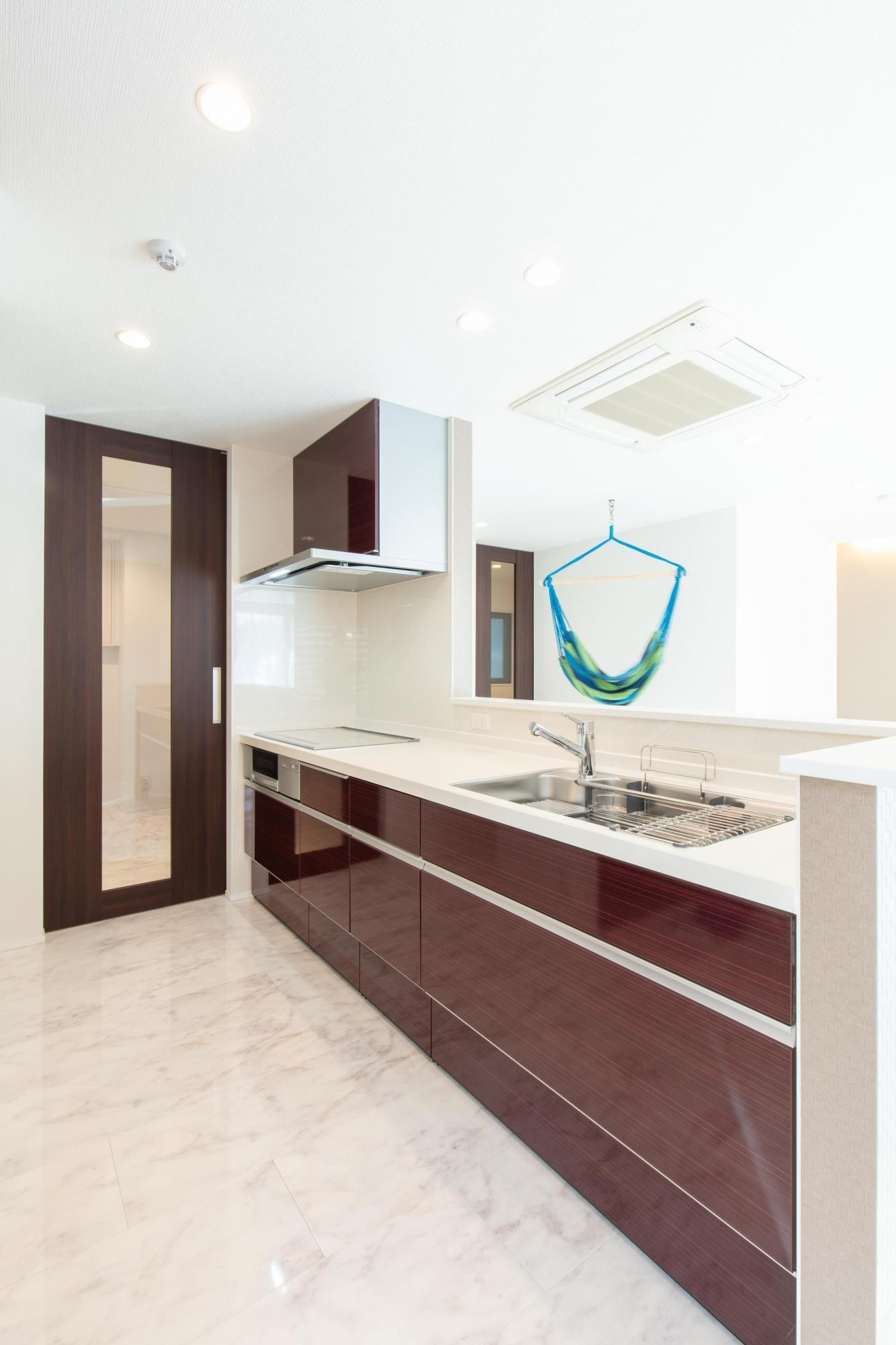 全面床は、お掃除簡単な大理石柄の鏡面仕上げを採用。 水廻り設備(ワークトップ・ユニットバス浴槽)は汚れにくくお手入れ簡単な人工大理石仕様にしています。