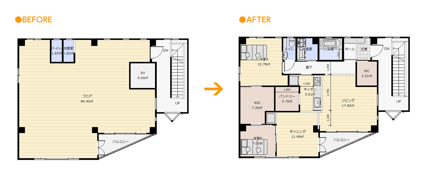 After:デッドスペースを最小限に抑えた、キッチンを中心にした回廊型プラン