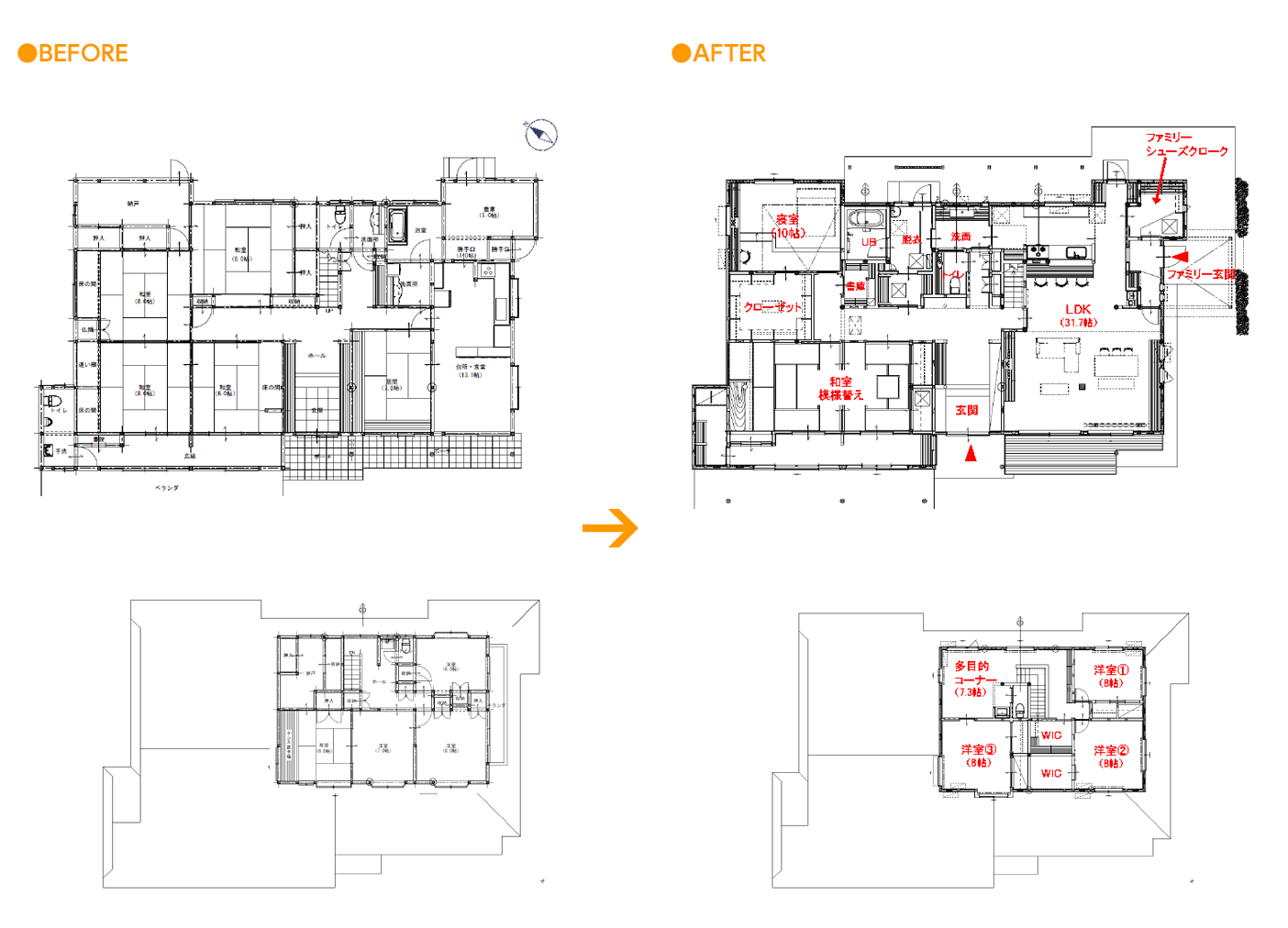 動線の悪かった住まいは、改修と同時に奥様の家事動線を考慮した間取りにし快適に楽しい暮らしになりました。