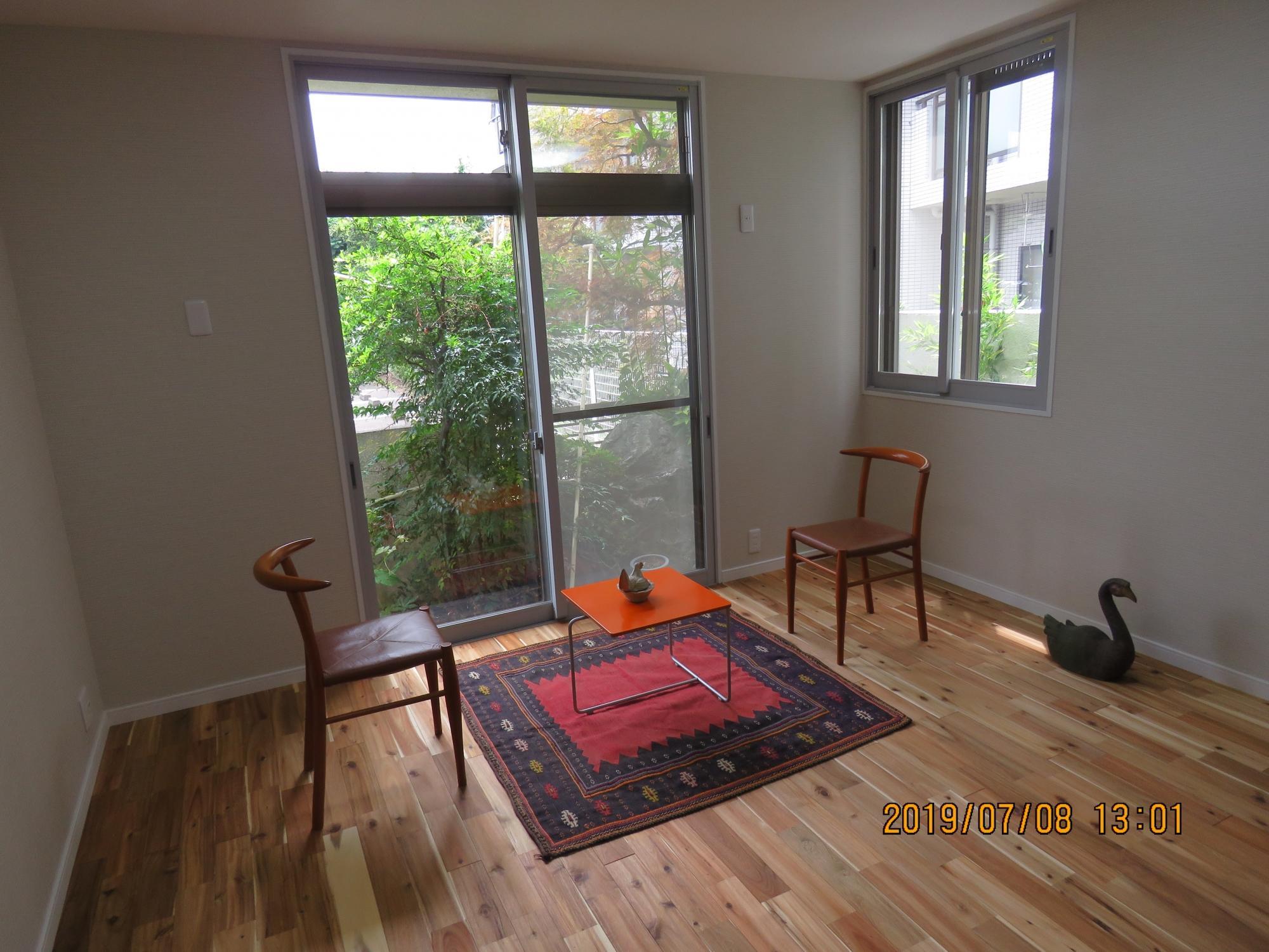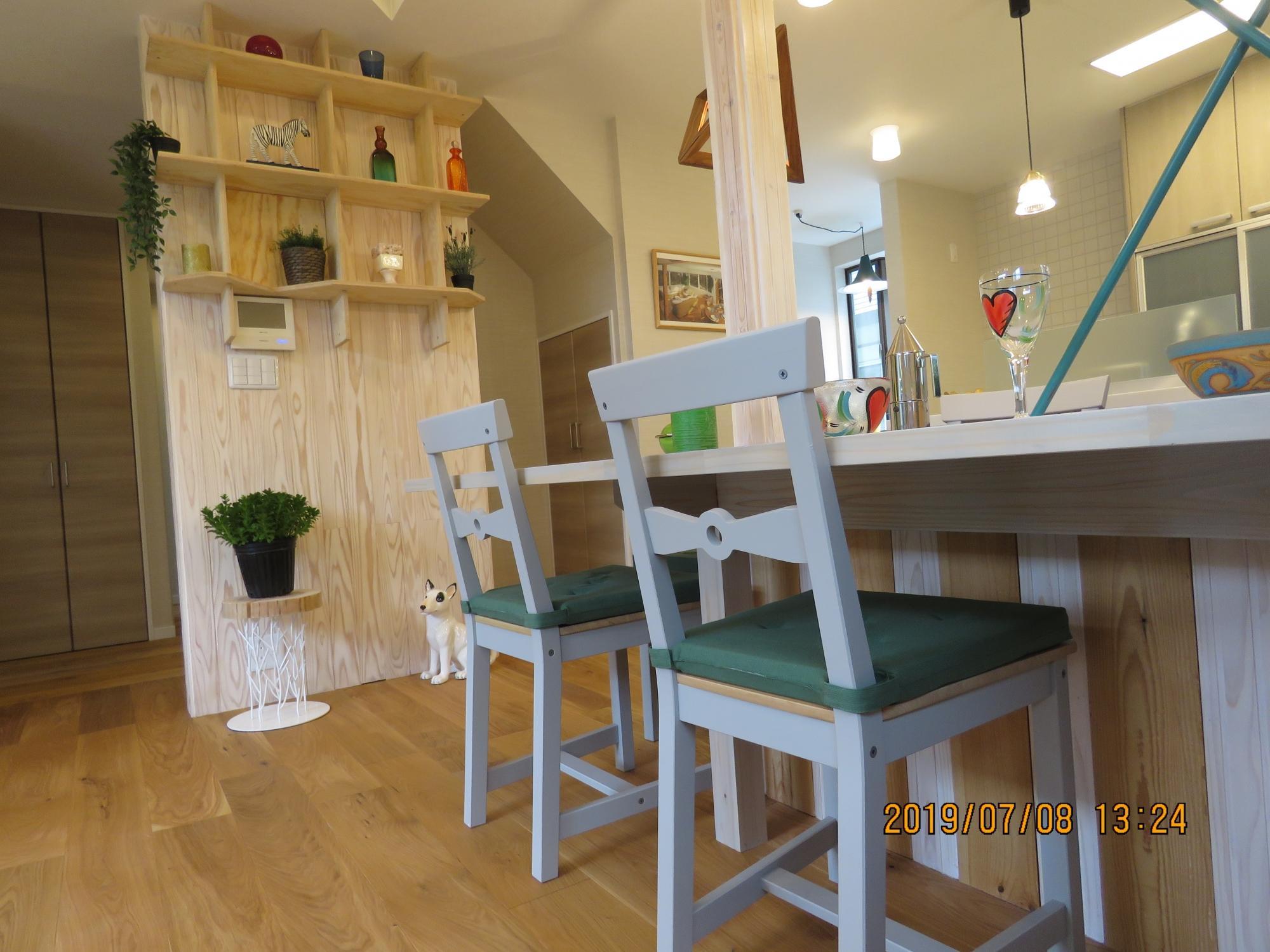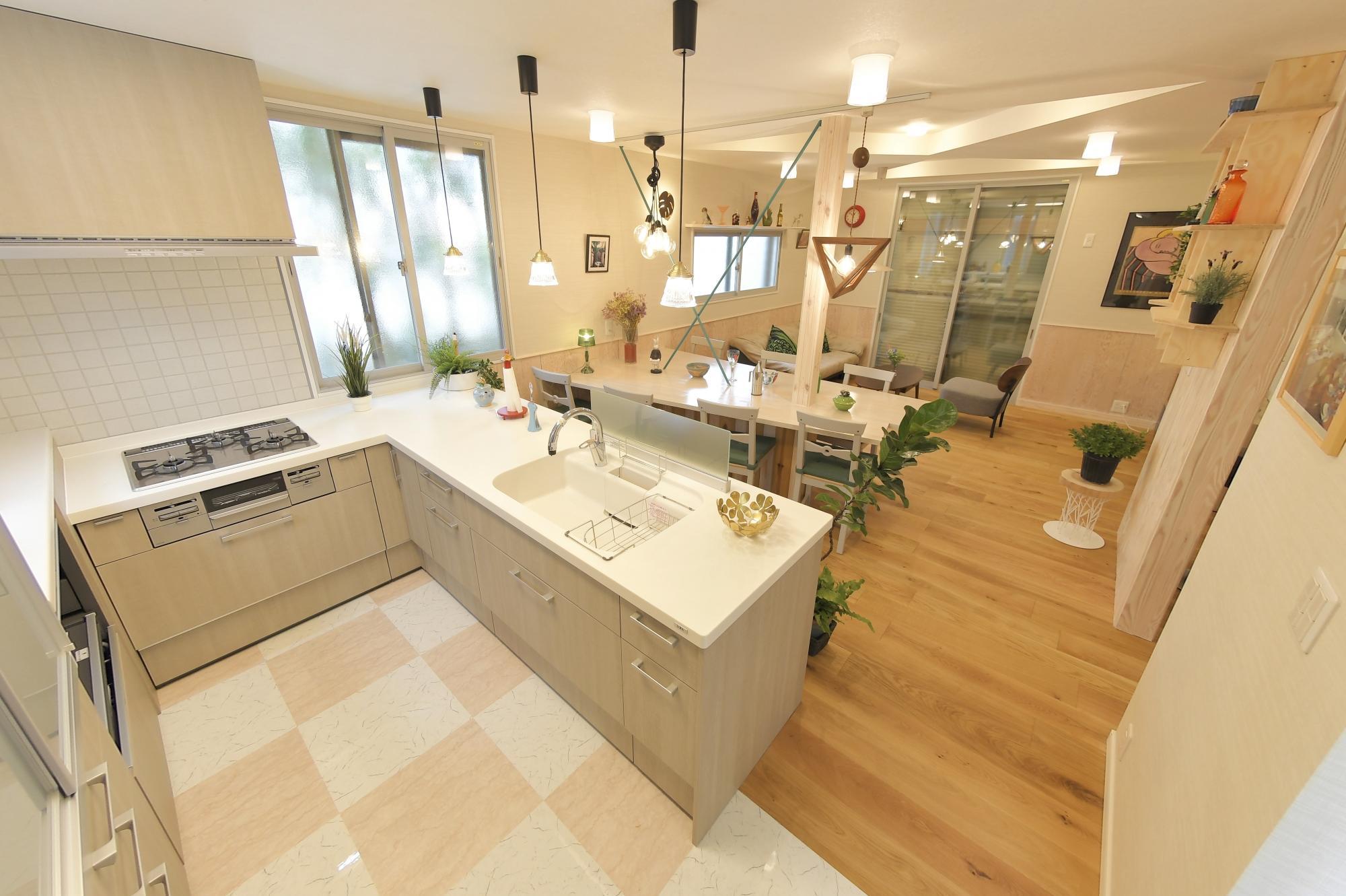 LIXIL社のL型キッチンの特徴も採用し、家電収納家具も備えた水廻り床にレストラン等の土足仕様全て硬質塩ビタイルを採用して汚れにくく仕上げた。1階部分の居室床は、オーク材及びアカシヤ材の無垢材フローリングを使用した耐摩耗の仕上げにしました。