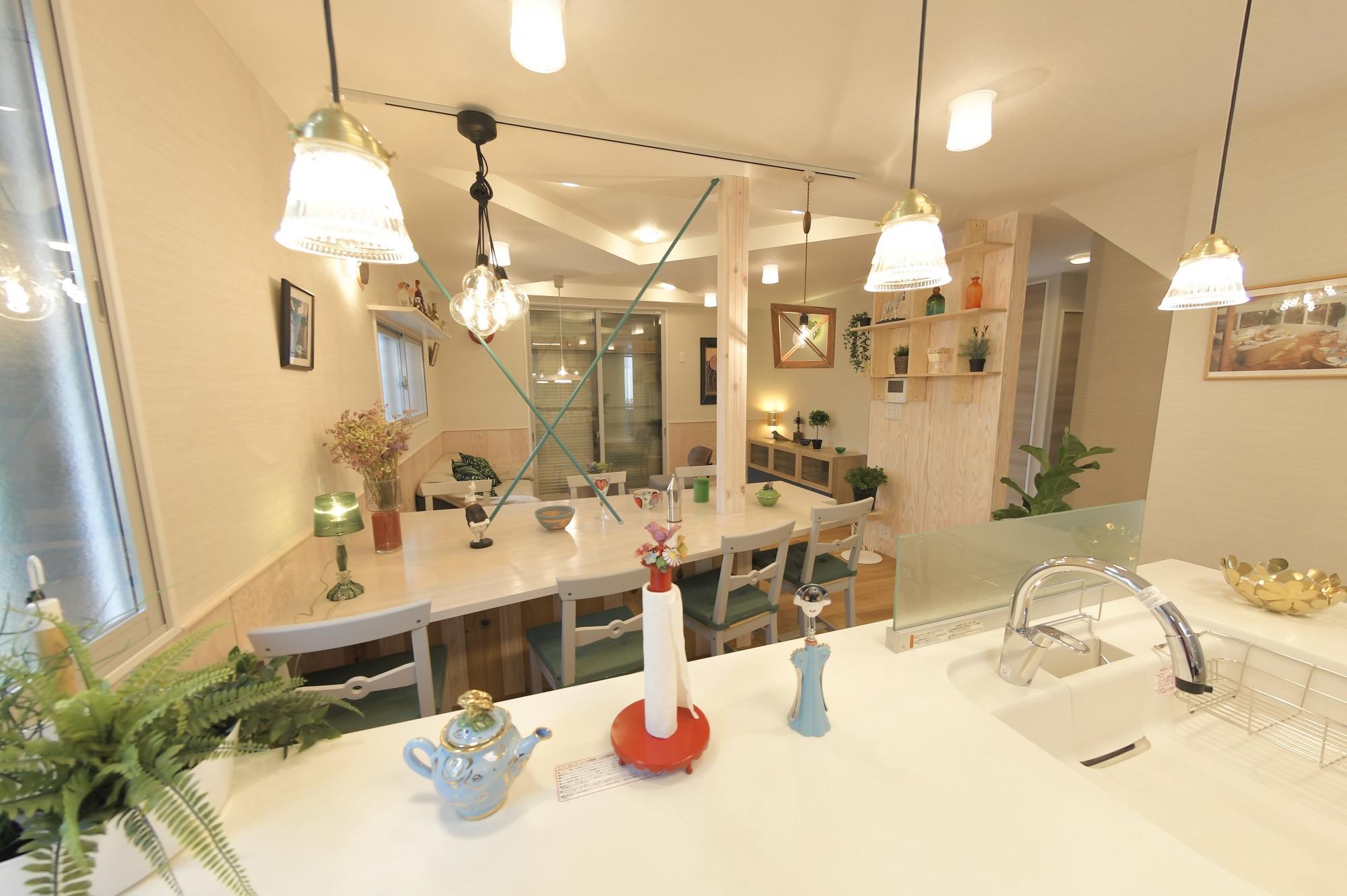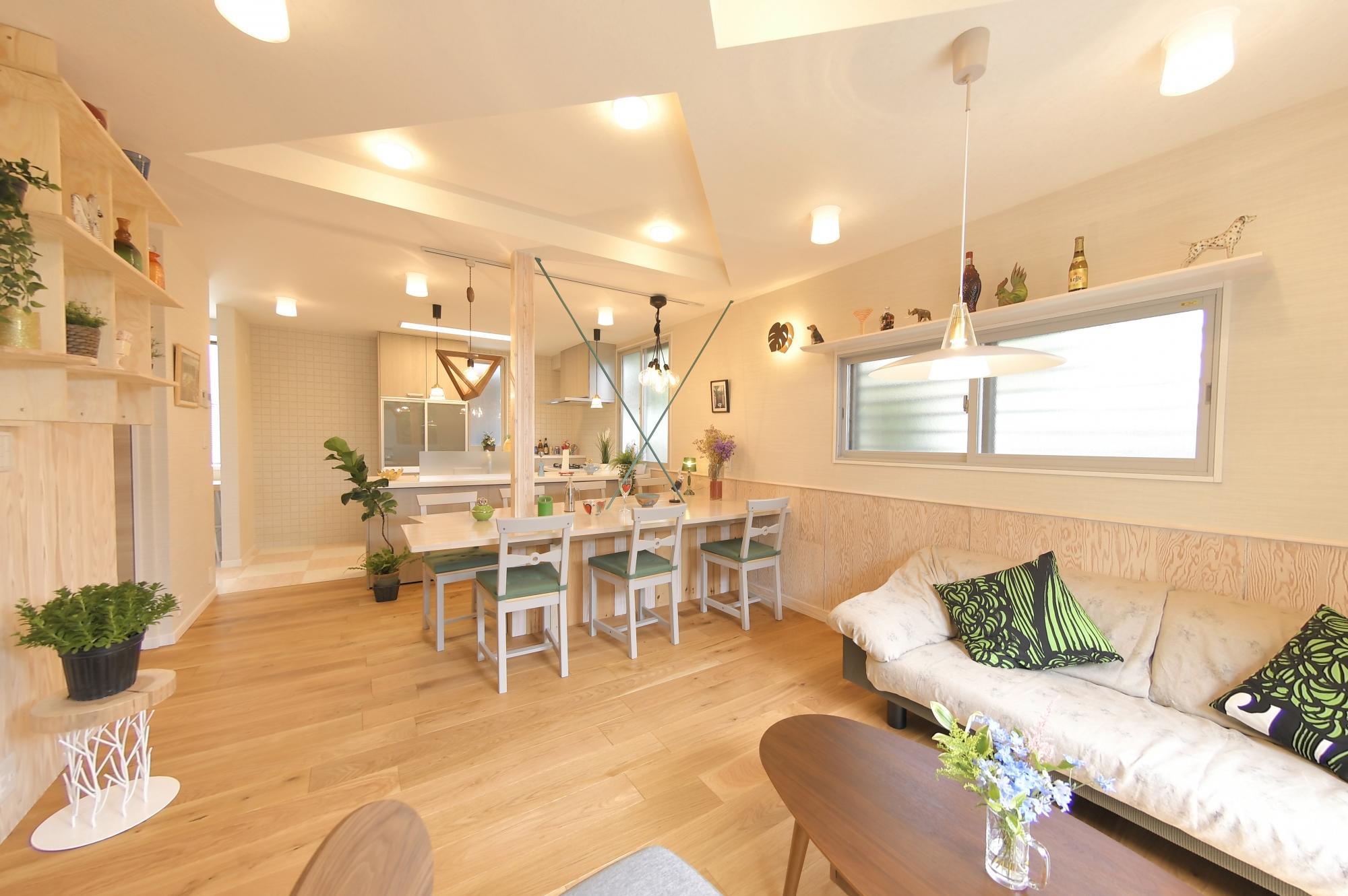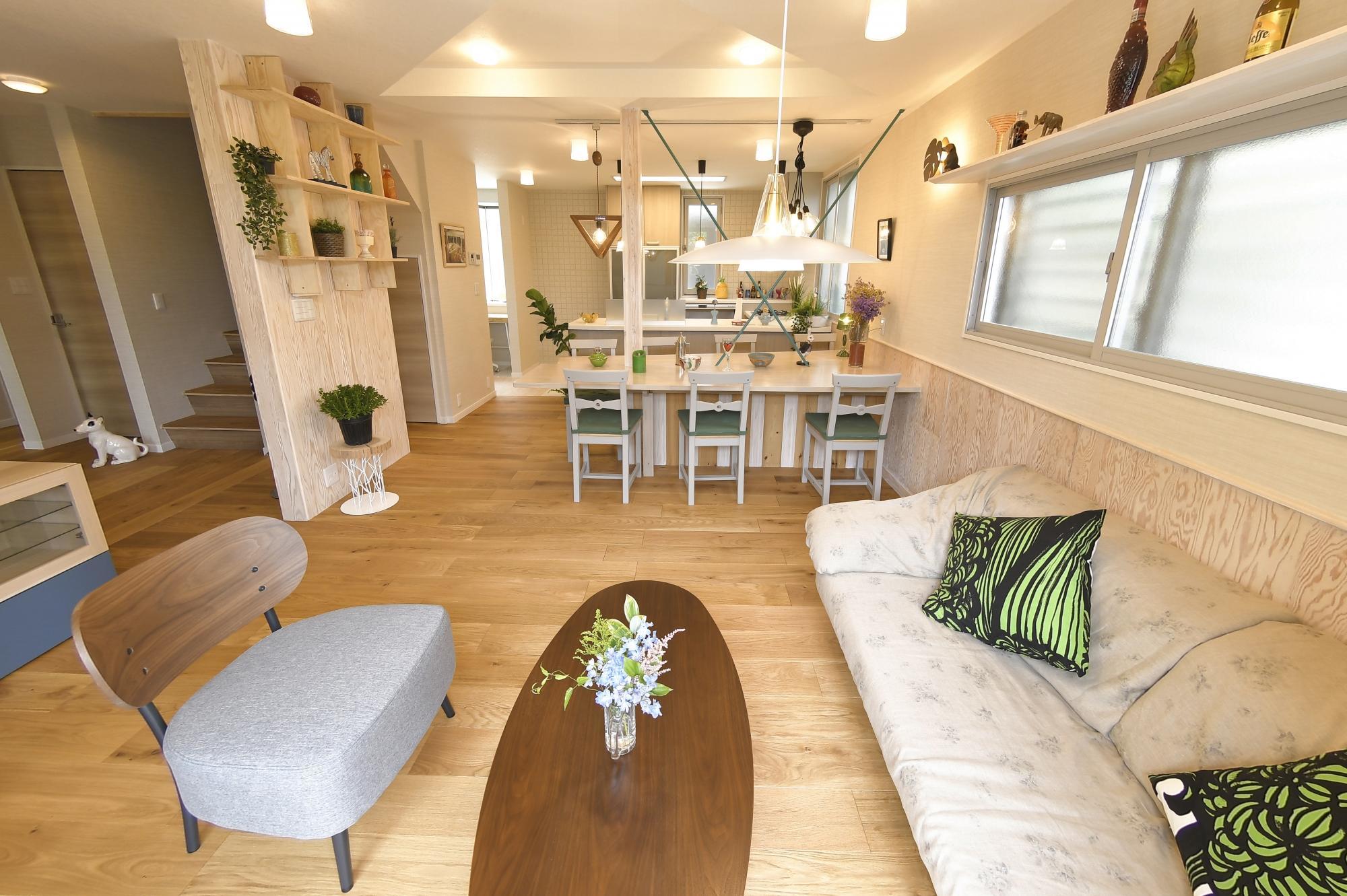 LIXIL社のL型キッチンの特徴も採用し、家電収納家具も備えた水廻り床にレストラン等の土足仕様全て硬質塩ビタイルを採用して汚れにくく仕上げた。1階部分の居室床は、オーク材及びアカシヤ材の無垢材フローリングを使用した耐摩耗の仕上げにしました。