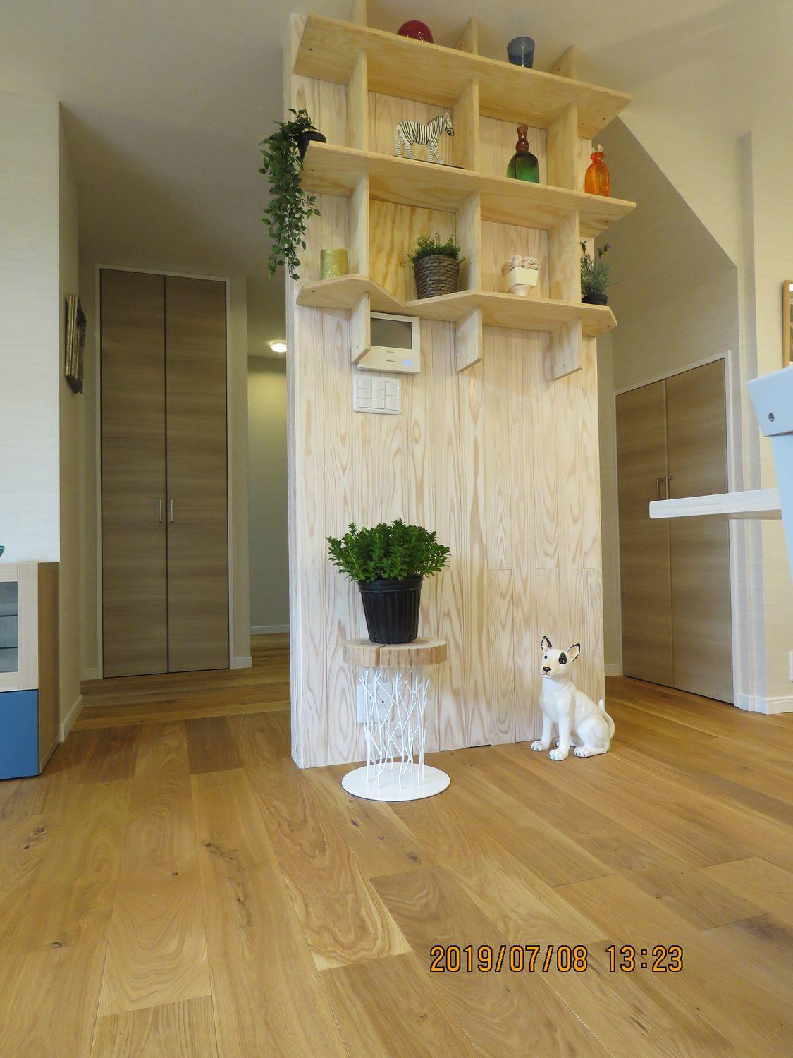 玄関収納2ヶ所、各居室の専用収納の他家全体に3ヶ所のクローゼットを設置。無垢フローリングを1階の部屋と階段に使用し、リビング壁に杉板や松板を貼る等、自然素材を多く使用してインテリア性を重視しました。コストを抑える為安価なインテリアを提案。