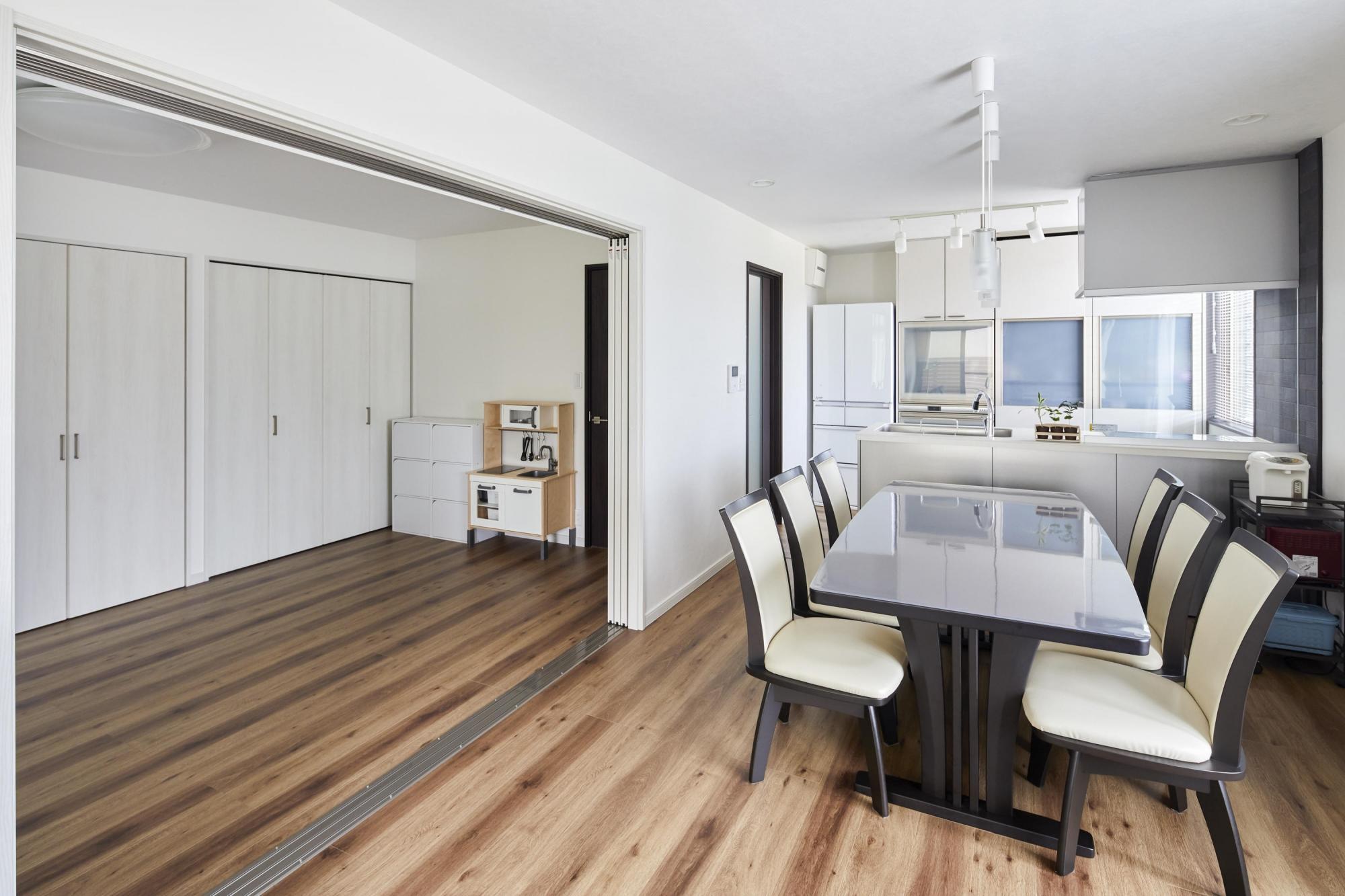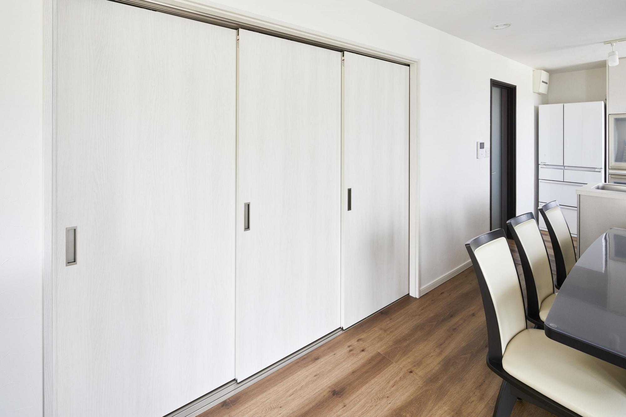 LDKと洋室を三枚引戸を開けたままにして空間を広く使うことができ、来客の際は閉めてプライベートが保たれます。