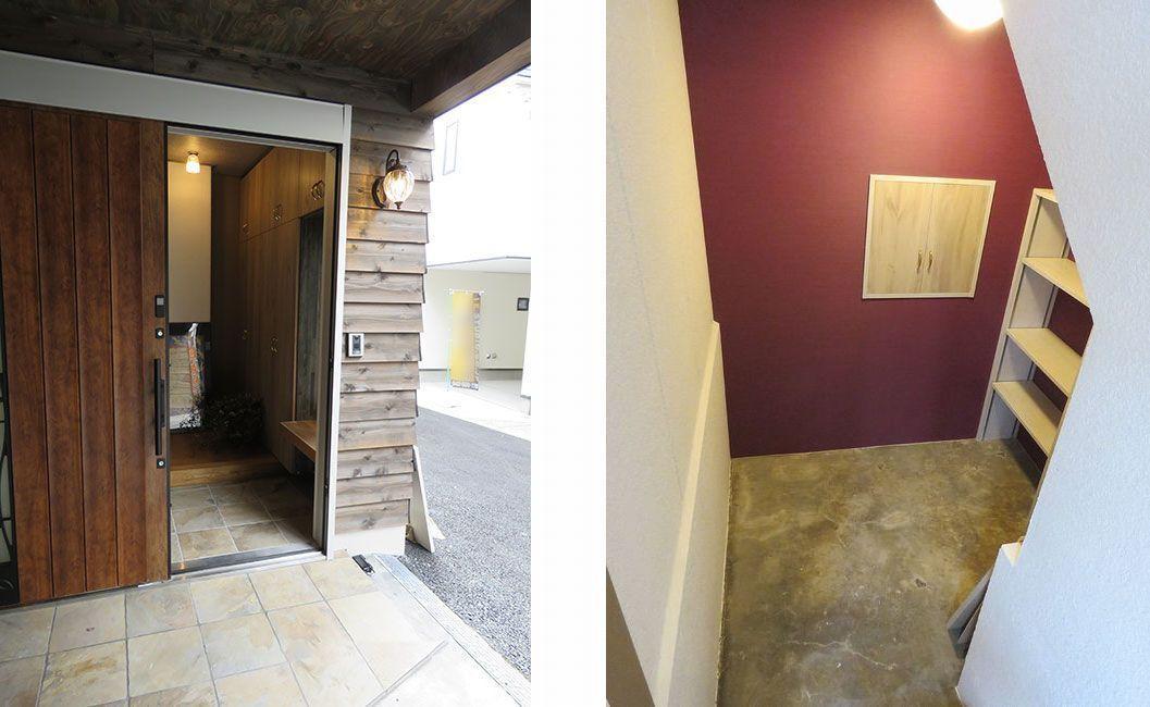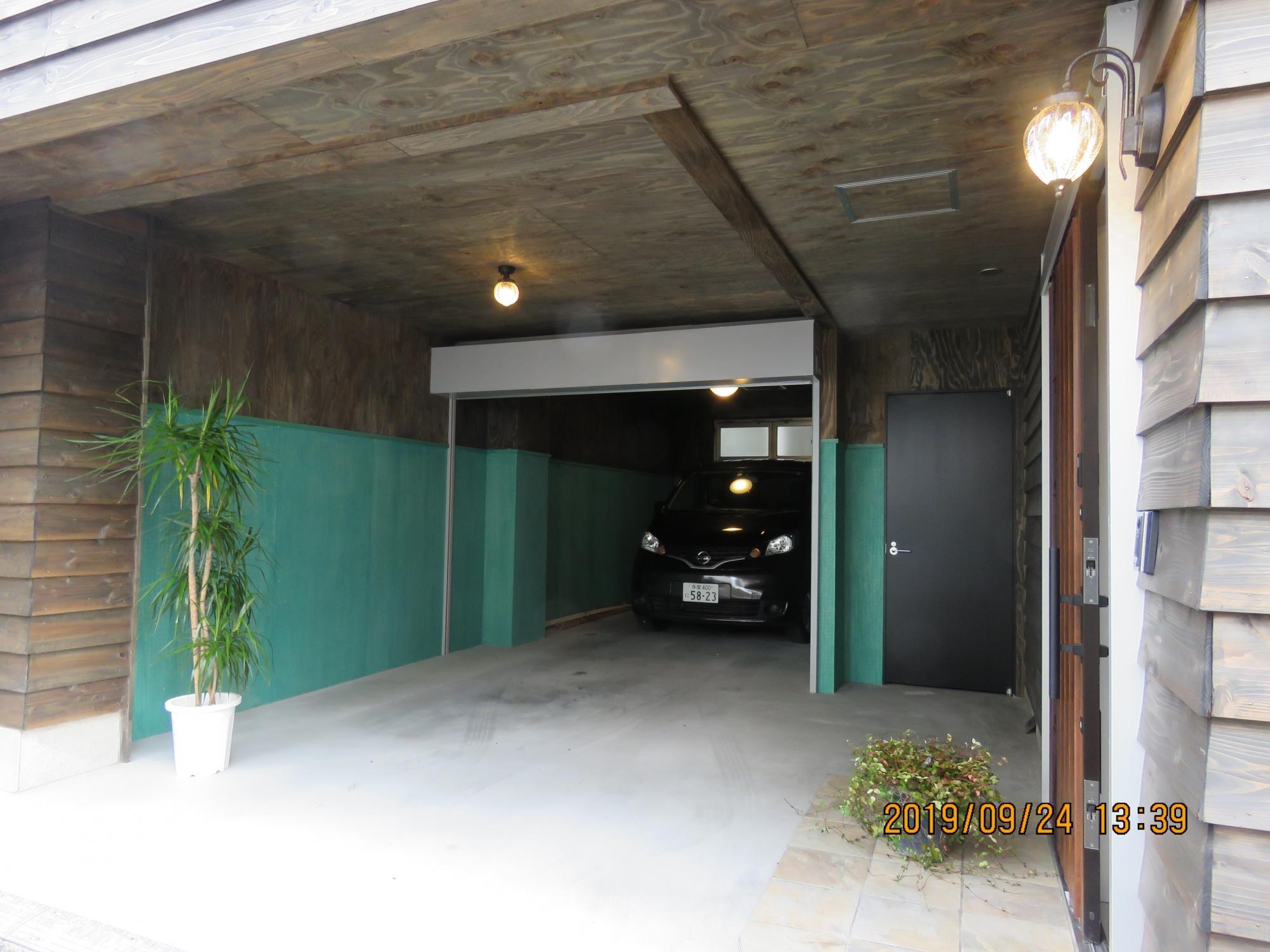1階店舗部分のところは全て撤去して車2台分のガレージと玄関にしました。車庫部分の壁と天井も松べニア合板貼の墨色染めとし腰壁を除く部分はアクセントとしてビビットなグリーン色で仕上としました。