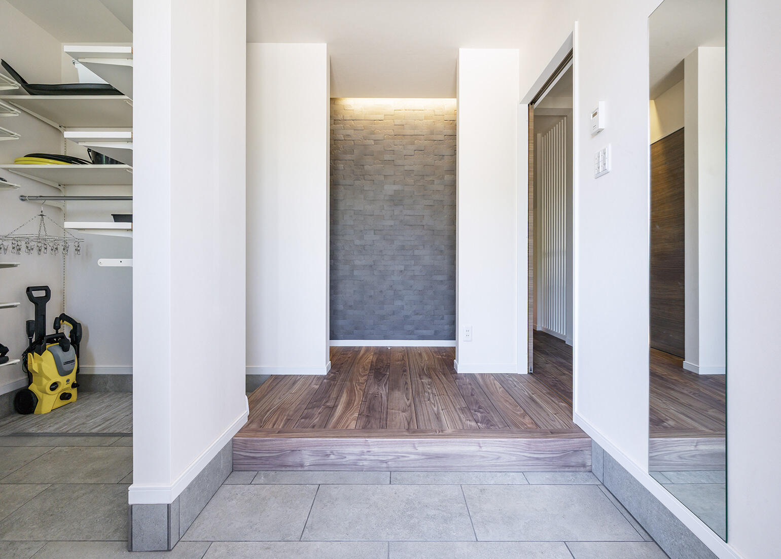 既存の間仕切りの多い空間を快適な住まいにするべく、立体的に空間をイメージできるパースなどを活用し、お施主様に寄り添いながら、家づくりを進めました。オープンなLDKに変更し、サンルームを設置。キッチンは回遊出来、LDKから水回りや個室への導線もシンプルにしたことで、動きやすくなりました。また、専用の玄関を設けた完全分離型の二世帯住宅とし、新設した廊下や扉から行き来できるようにしました。