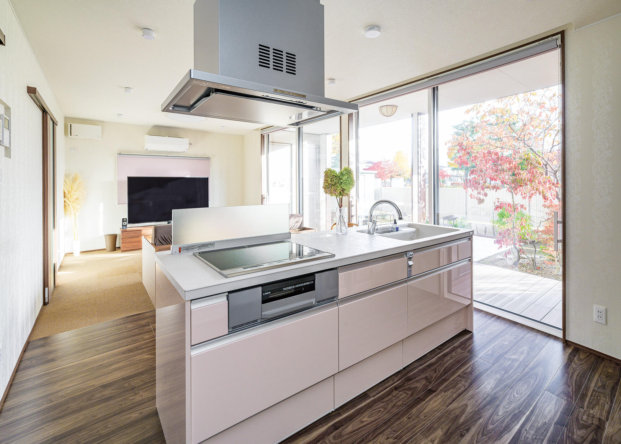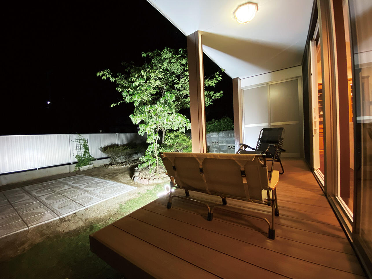 南側の濡れ縁はスペースを広げてデッキとなり、朝、夫婦でコーヒーを楽しむ、とっておきの場所になりました。また、庭には、2匹の愛犬が元気に走り回れるドッグランをつくっていただきました。たとえばリビングで孫がゴロゴロしたり、デッキでくつろいだり、庭ではワイワイできる。思い思いに過ごせるのが良いです。